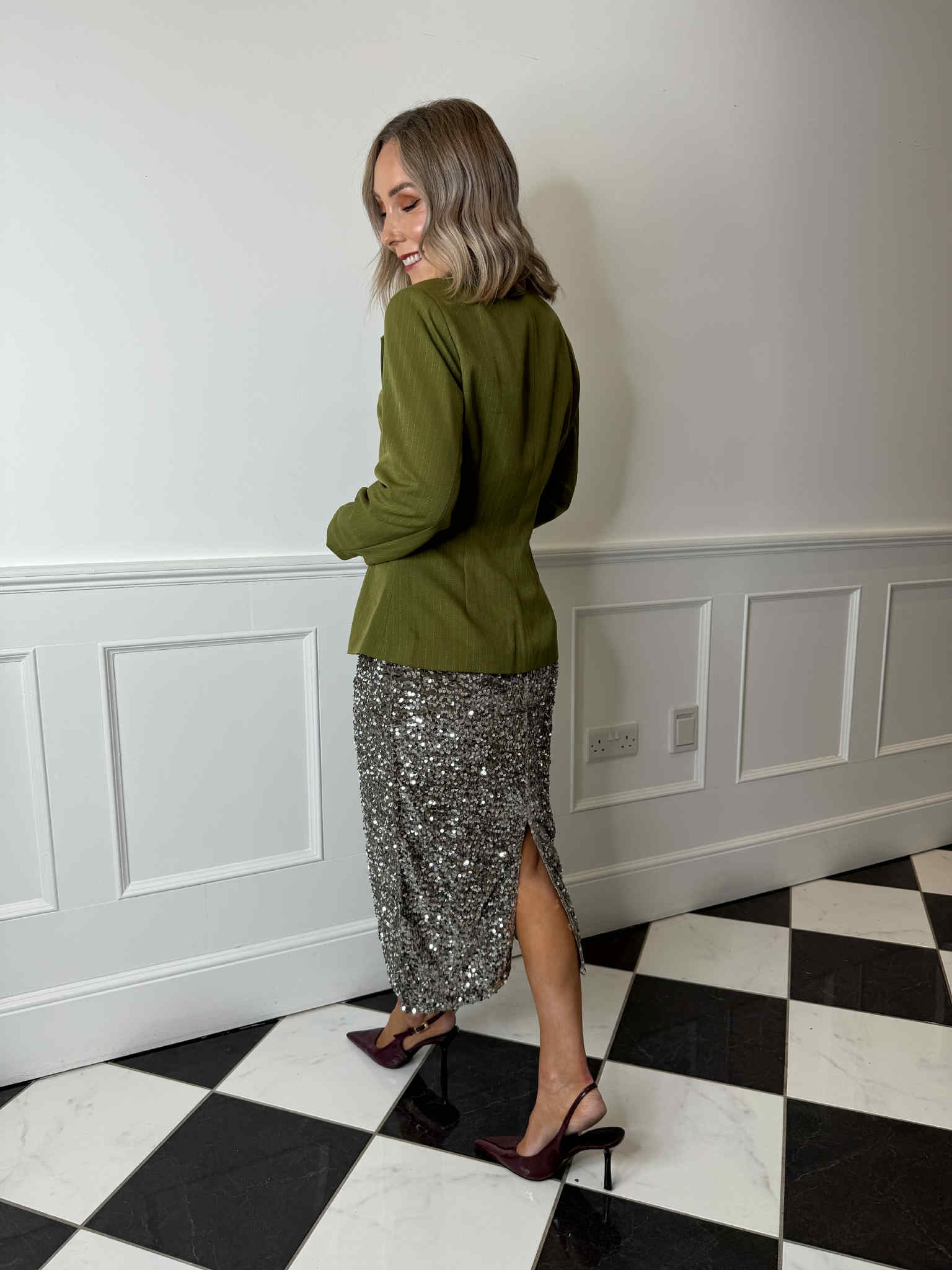 A sleek, light-catching midi skirt designed to elevate evening dressing. Crafted from plush velvet layered with all-over sequins, it offers refined shimmer with a softly structured finish. Cut to a slim pencil silhouette with an elasticated high waist, it flatters the figure while ensuring effortless comfort. A back slit adds ease of movement and subtle sophistication. Designed as part of a co-ord set, it pairs perfectly with the matching sequin tank top for a cohesive, high-impact look. Made with recycled polyester to reduce environmental impact without compromising style.
