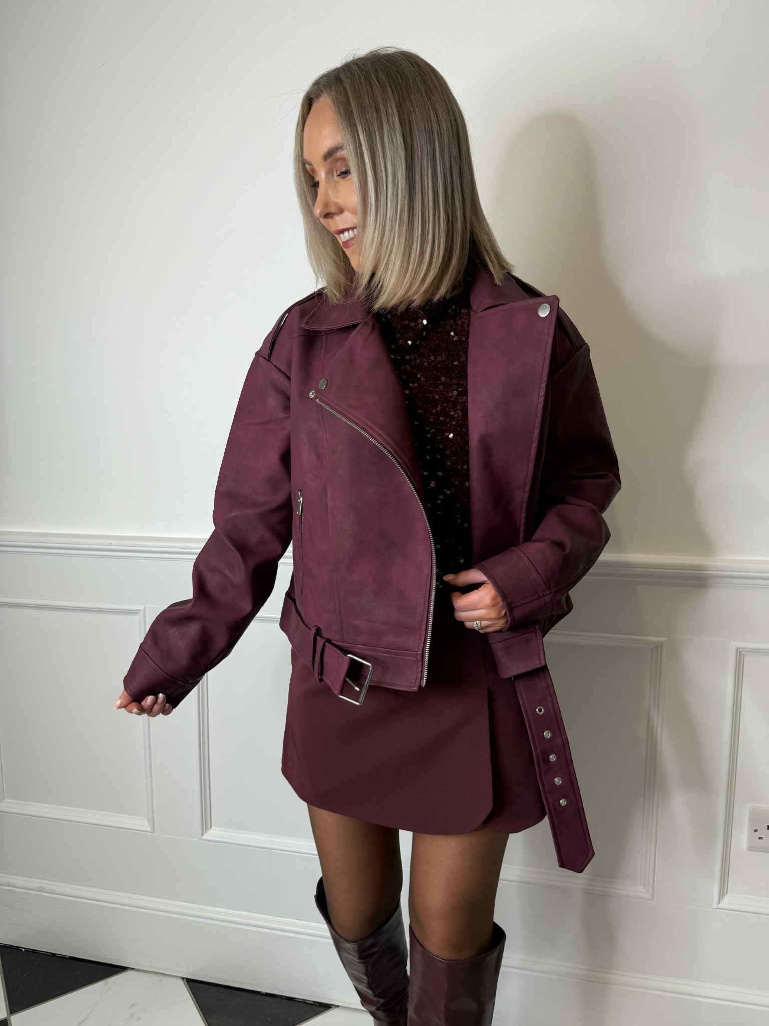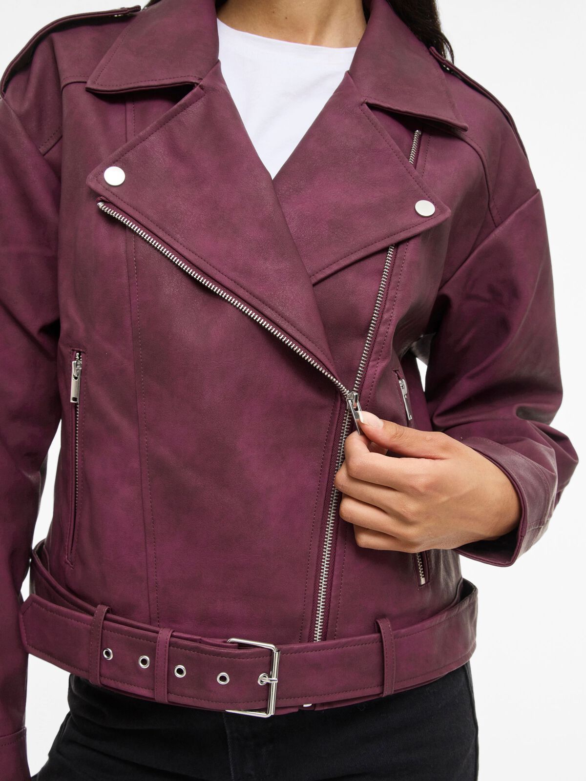 Make a bold statement with the Line Biker Jacket in rich plum. Designed with a classic biker silhouette, this jacket features long sleeves, a zip fastening, and front pockets with zip closures for added edge. The belt loops with a removable belt at the waist allow you to customize the fit, adding a modern twist to the timeless biker style. Crafted from durable 100% Polyester with a polyurethane coating, this jacket combines both style and functionality, offering a sleek finish that’s perfect for day-to-night wear.