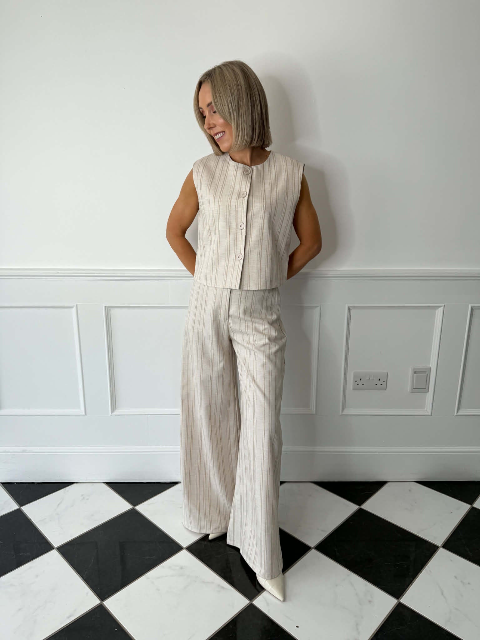 High-waisted trousers in a soft oatmeal fabric with a subtle pinstripe detail. Featuring a wide-leg silhouette, side pockets and a front button with zip fastening. Designed for a structured yet effortless fit.