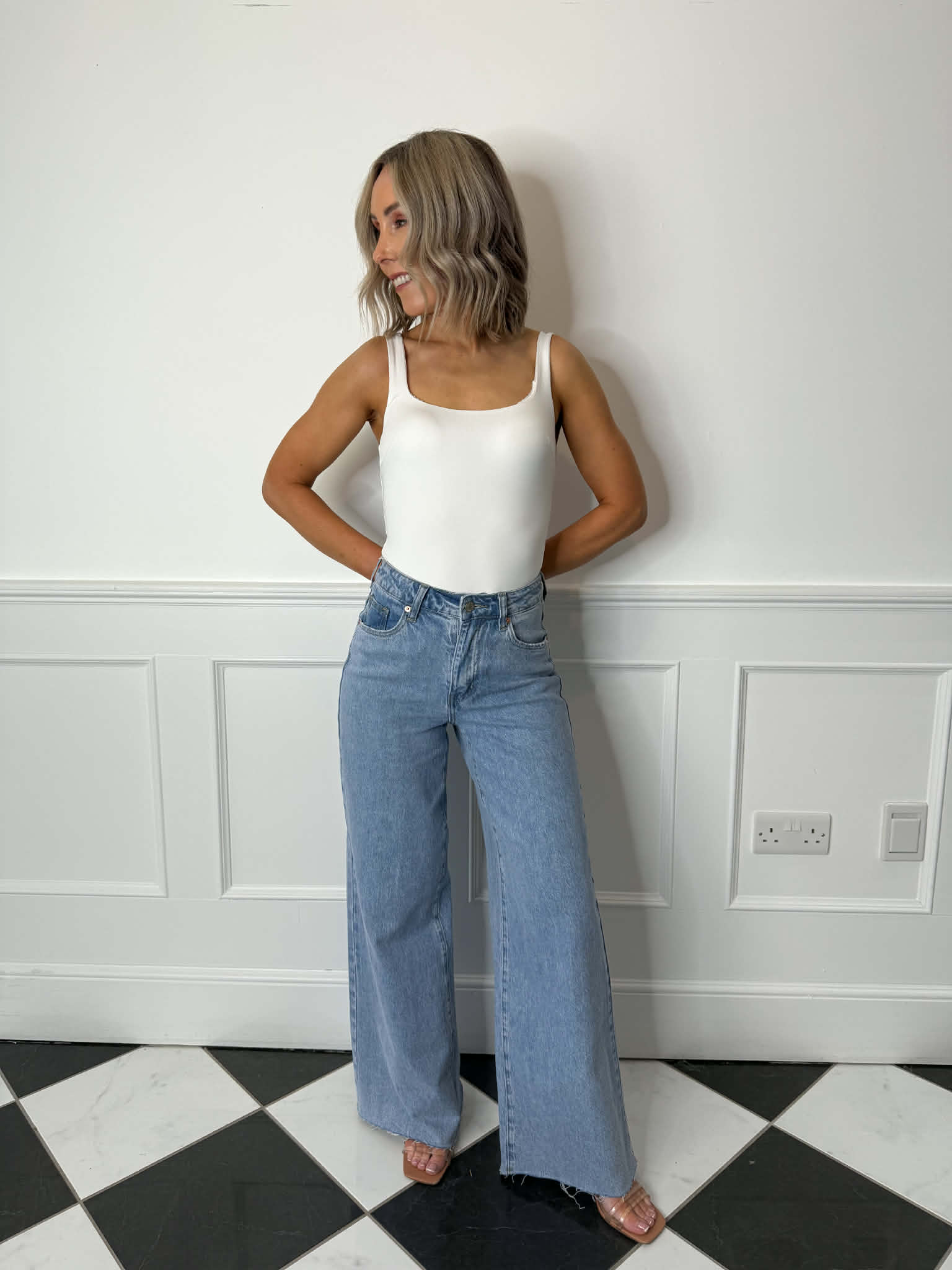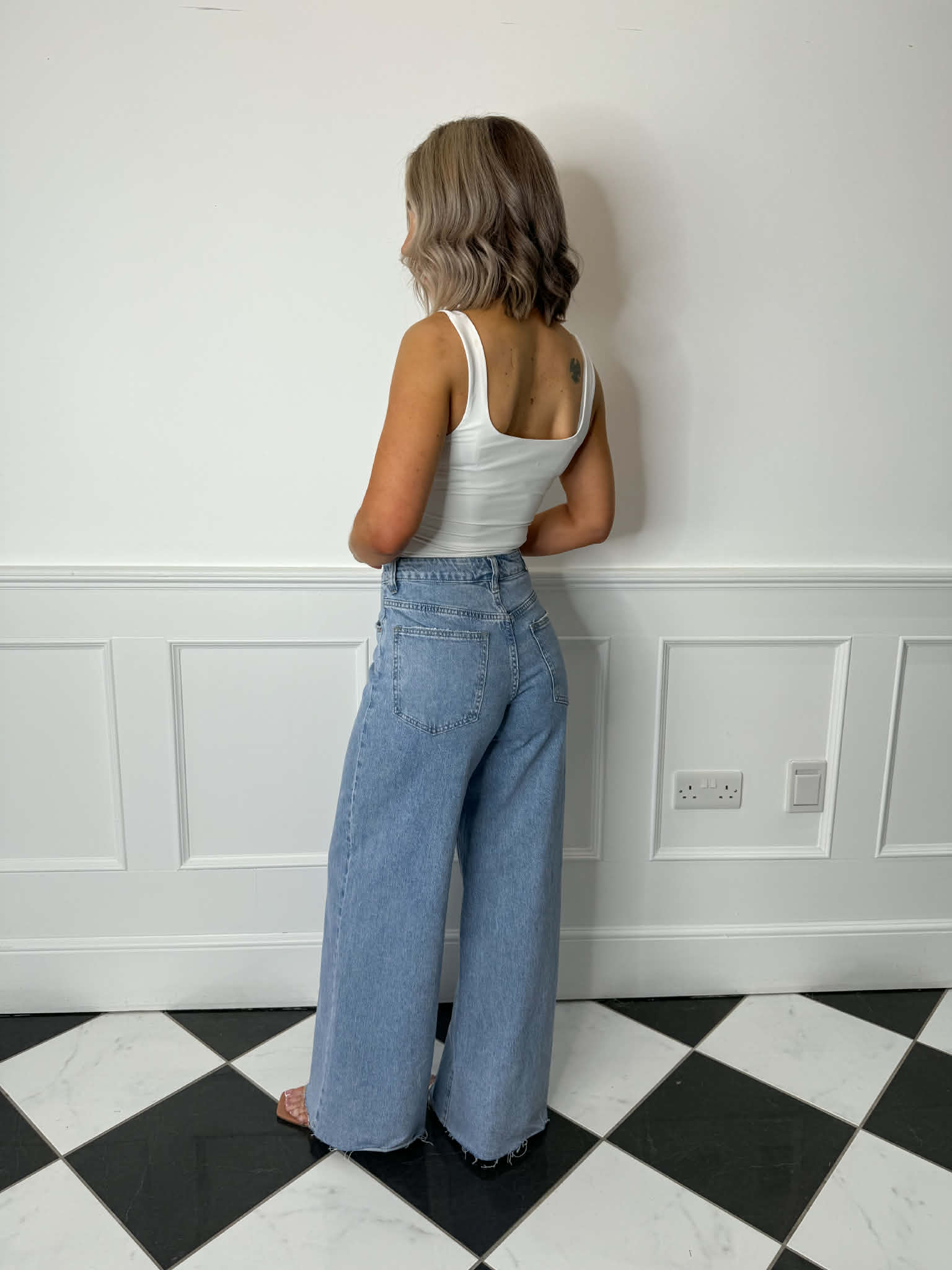 A flattering high-rise fit, they feature a roomy wide leg silhouette that elongates the figure while allowing easy movement. The light blue wash gives a fresh, lived-in feel, while the raw frayed hem adds a touch of laid-back attitude.