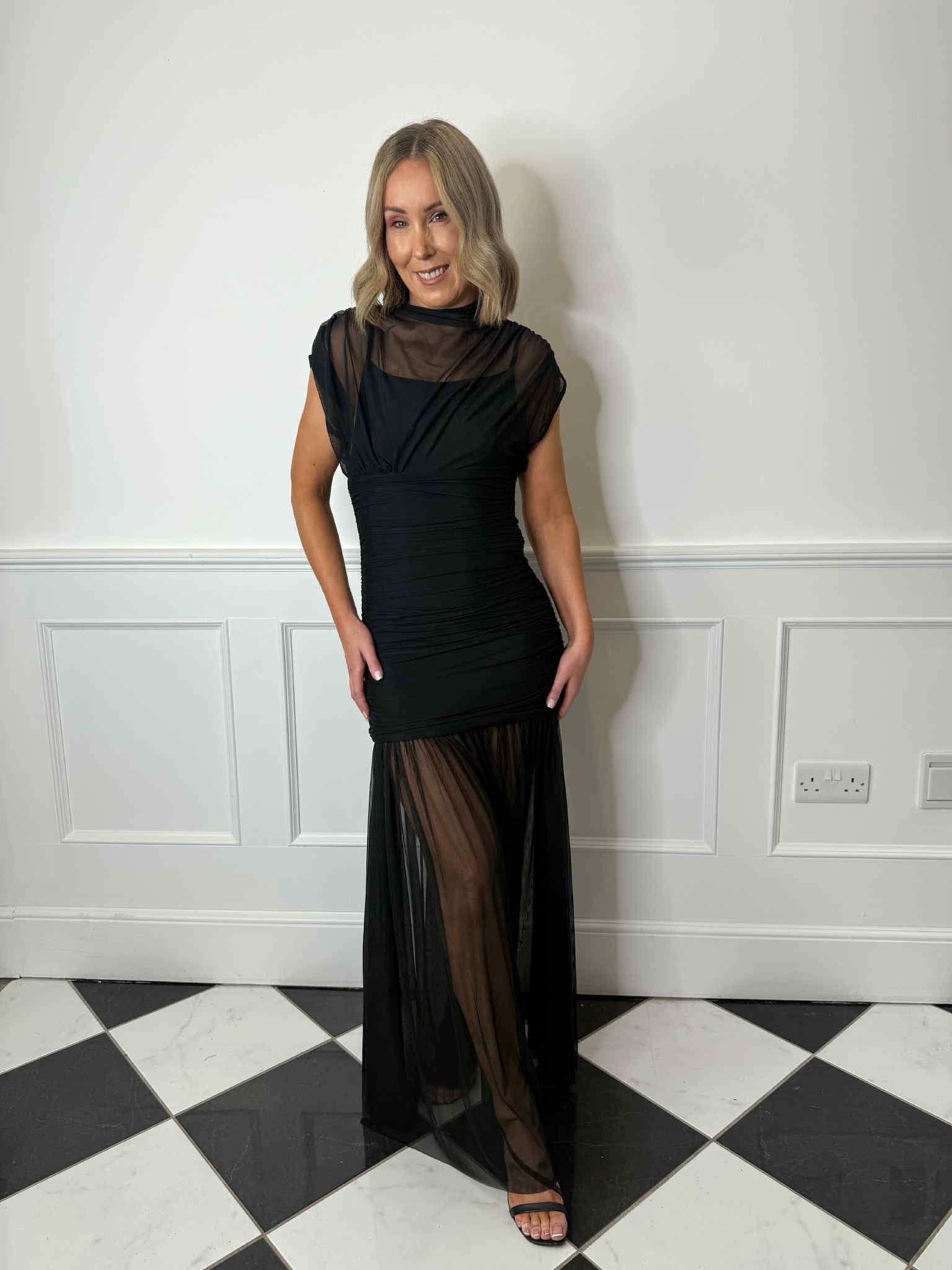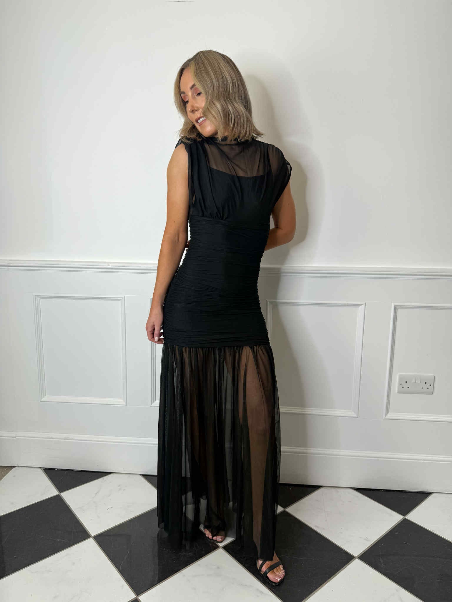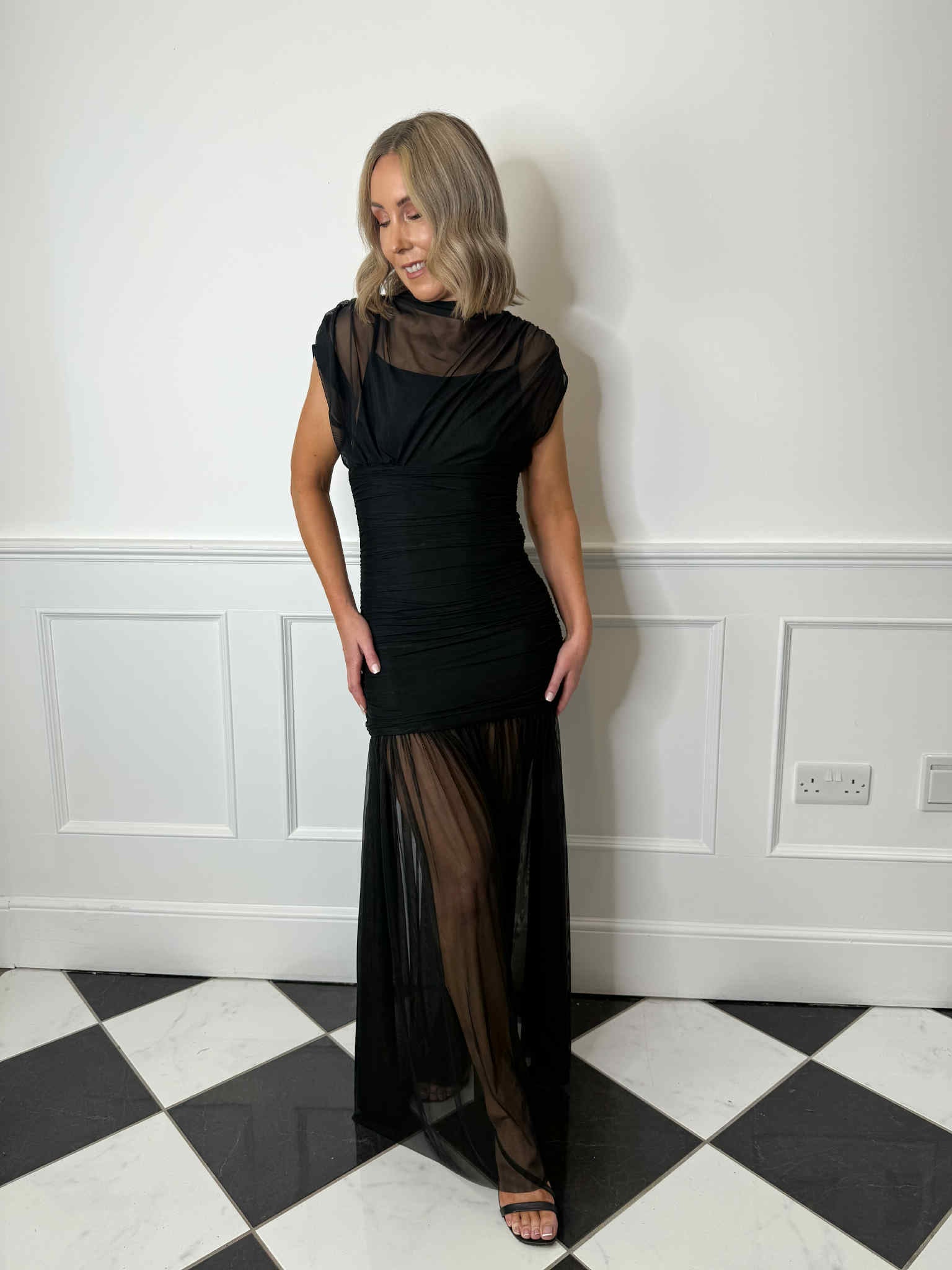 Turn heads in the Blair Sheer Mesh Maxi Dress, a striking bodycon evening silhouette designed to flatter and enhance your figure. Featuring a sleek high neckline and elegant cap sleeves, this dress is finished with a sheer mesh overlay for a sensual, elevated look. Strategic ruching at the waistband accentuates the waist, while the long, flowing sheer skirt creates graceful movement with every step.