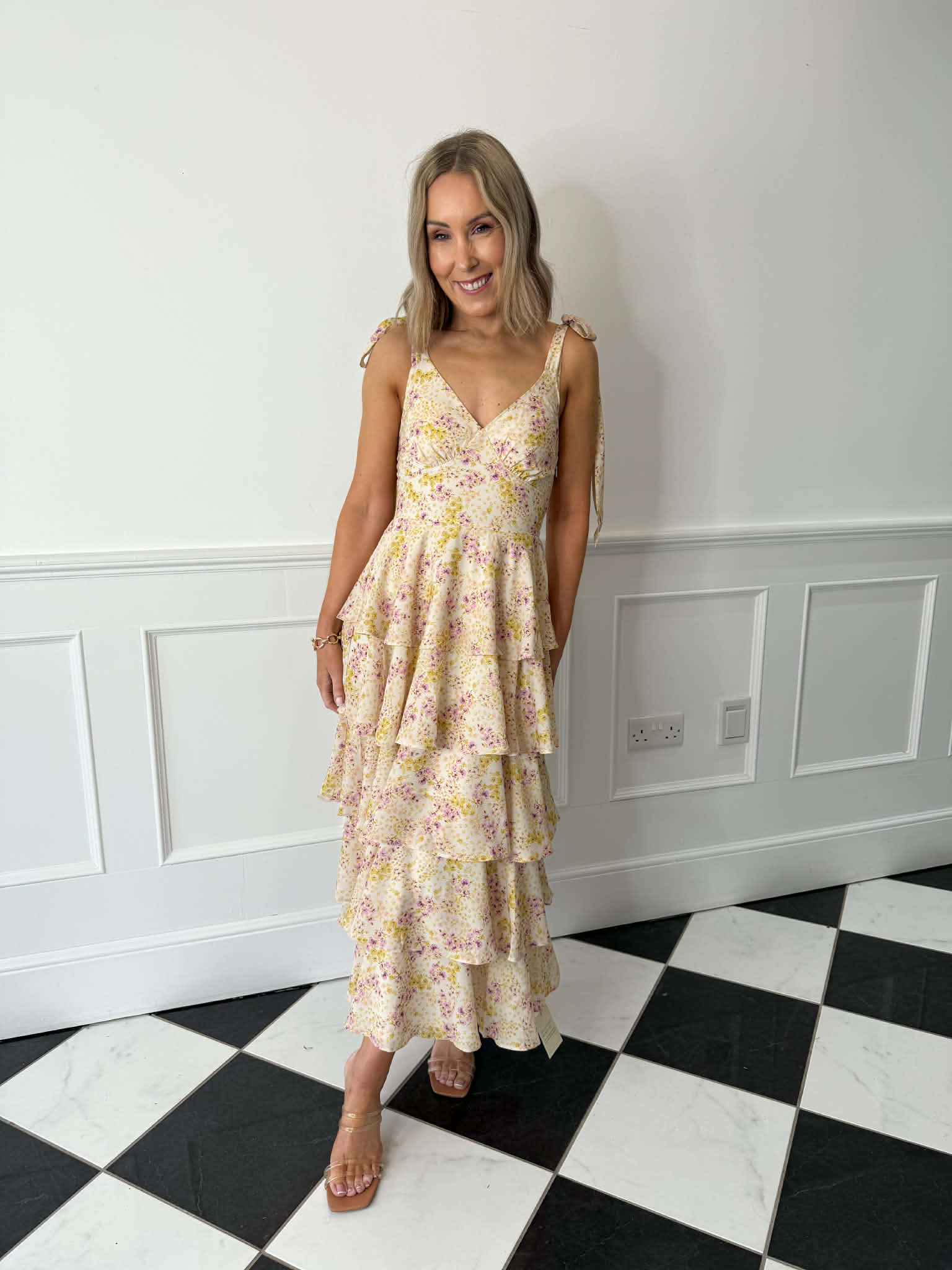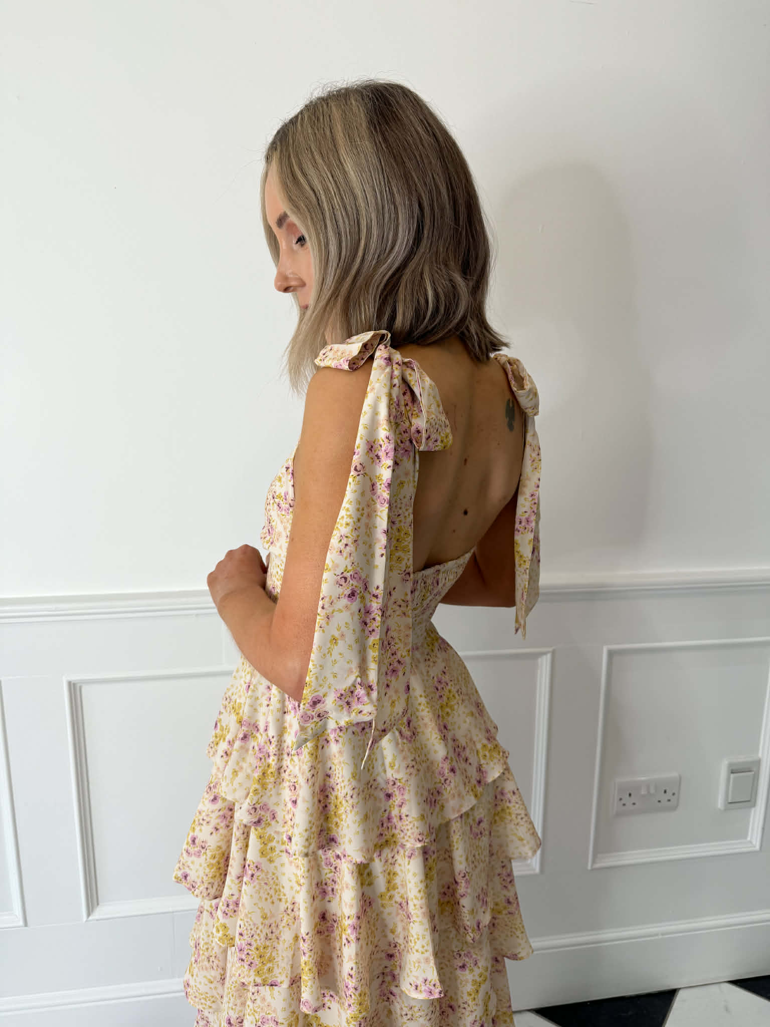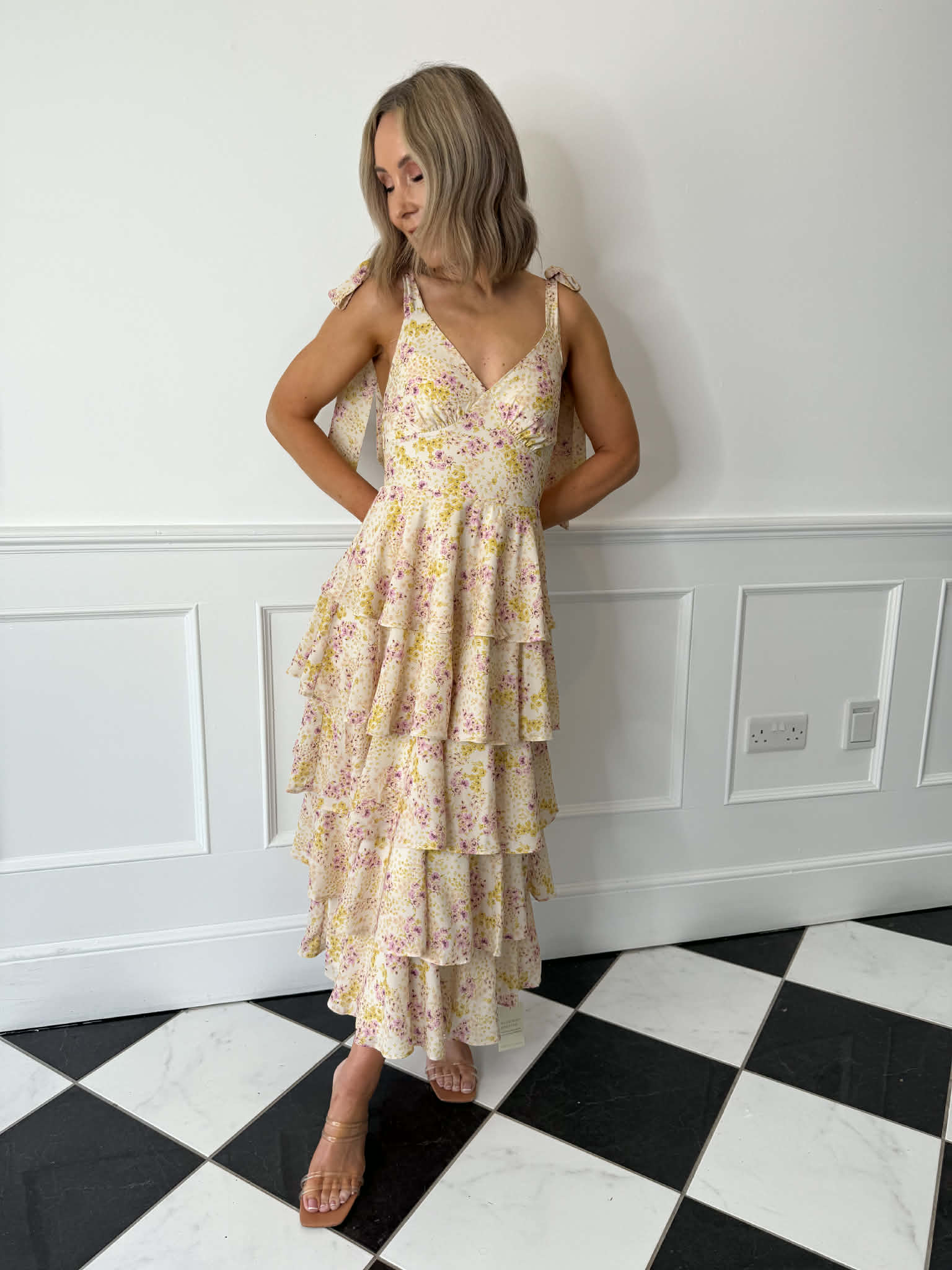 Floaty and feminine, the Fiore Tie Ruffle Maxi Dress in Ditsy Floral is designed to make an effortless statement. Featuring functional tie straps and delicate tiered ruffle detailing, this maxi dress moves beautifully with every step. Crafted from luxurious printed chiffon and fully lined for comfort, it’s finished with a shirred back for a flattering and flexible fit; perfect for weddings, garden parties, and sunny-day occasions.