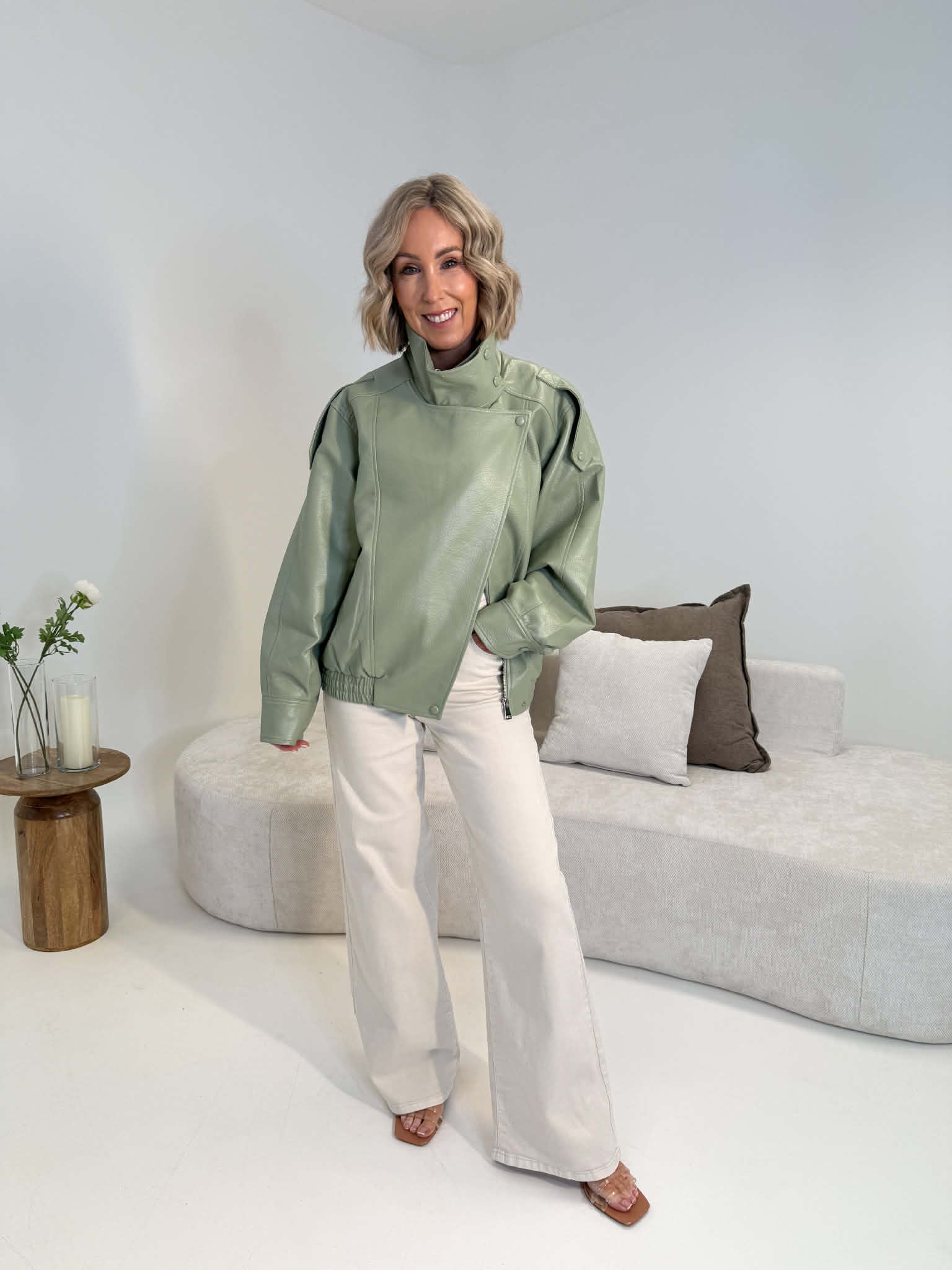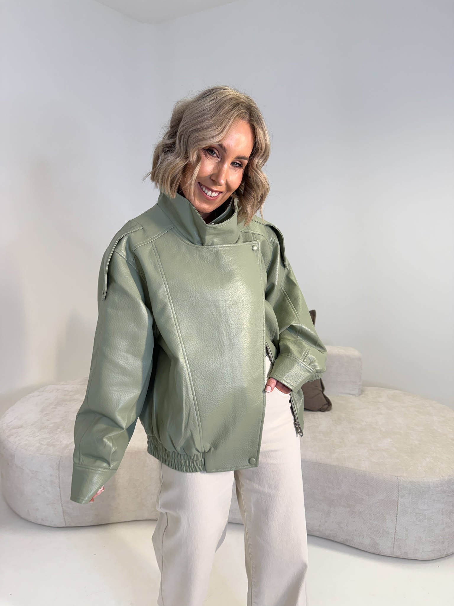 Jacket in soft, buttery PU fabric with a modern, structured silhouette. Designed with a funnel neckline, front zip fastening, and a button detail for asymmetric styling. Finished with practical pockets and long sleeves.