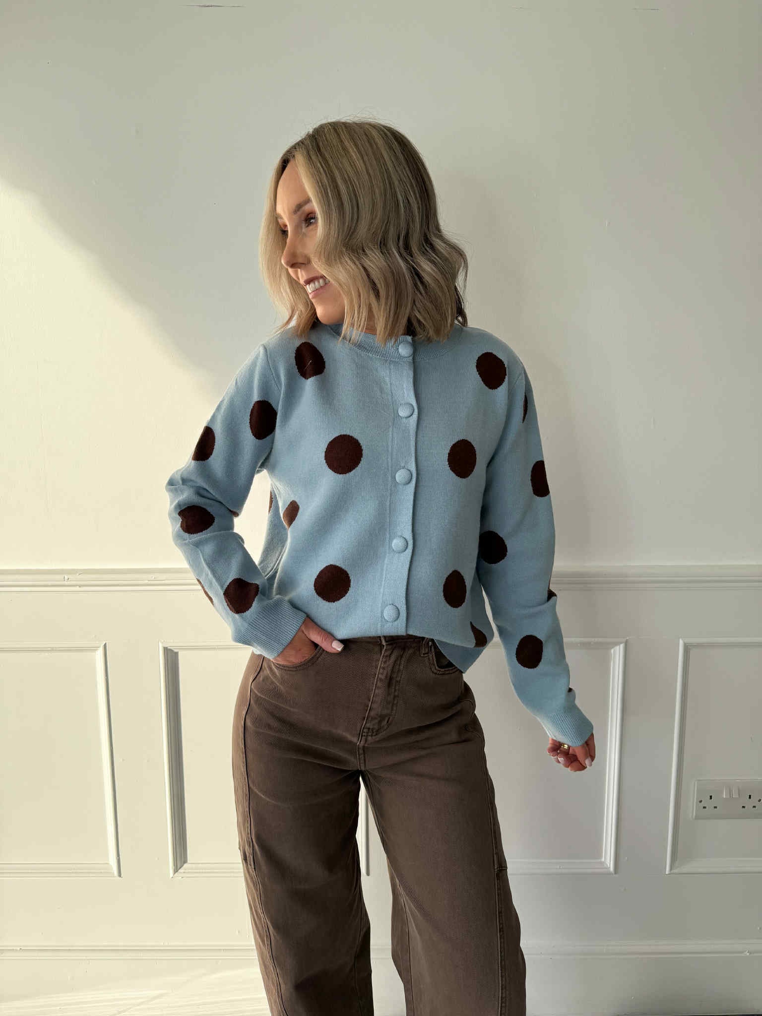 Our new throw-on-and-go knit with a playful twist. Crafted from a cosy, thick knit fabric, this long sleeve cardigan features a classic polka dot design all over. Perfect for layering over tees, dresses or knits, it’s as practical as it is stylish.