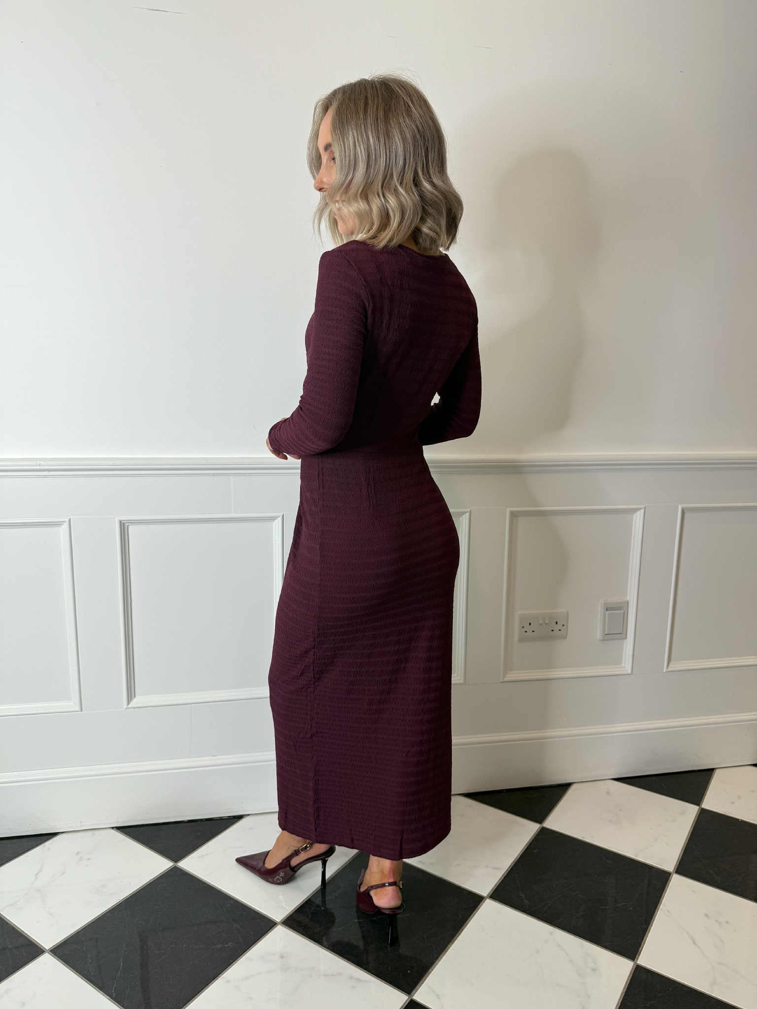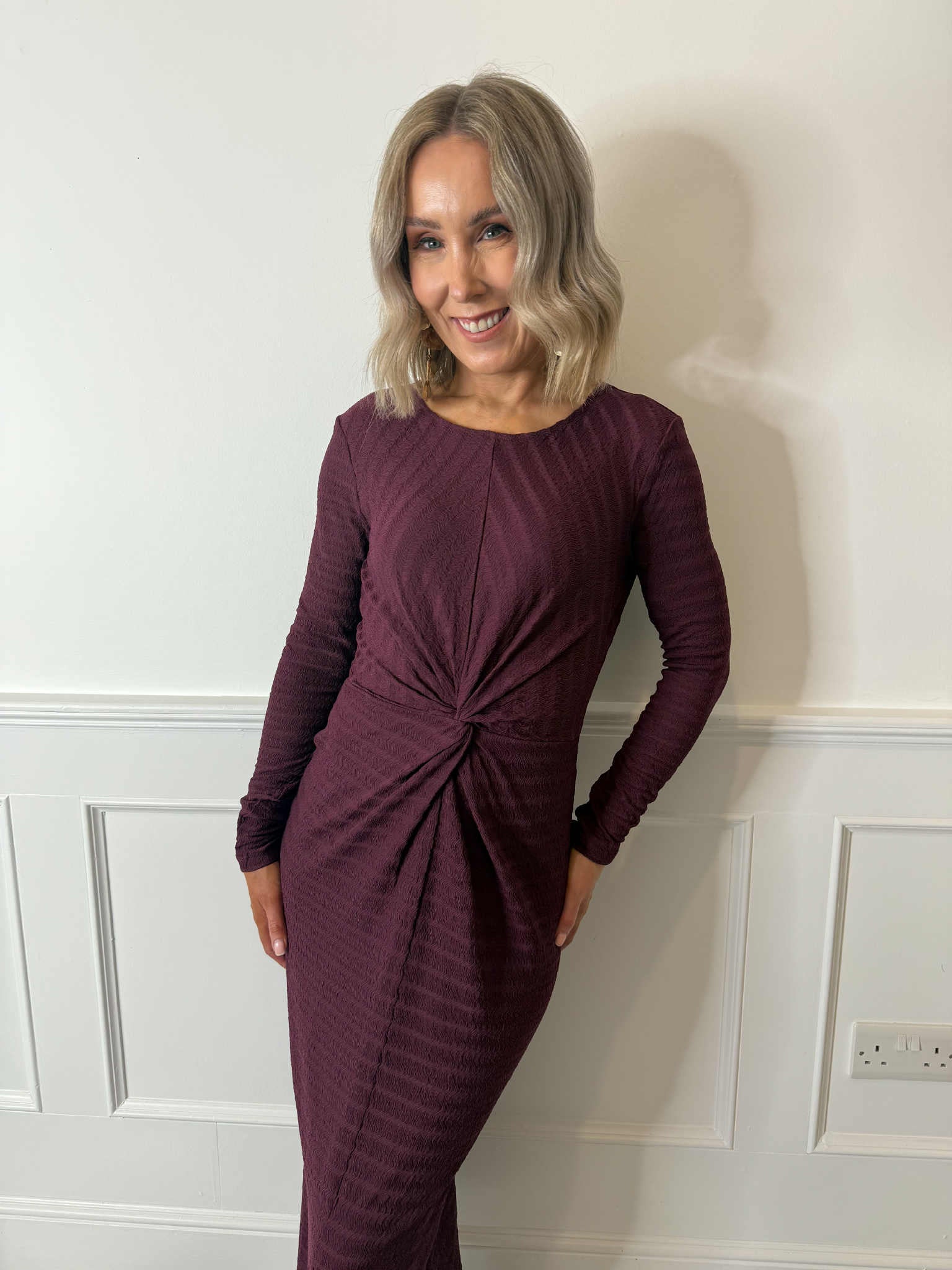 The Cavalina Midi Dress blends elegance and effortless style. Crafted from a textured, stretchy fabric, it features long sleeves, a front slit, and knot and ruching detail at the front for subtle shaping and visual interest. A versatile midi-length dress perfect for both day and evening occasions.