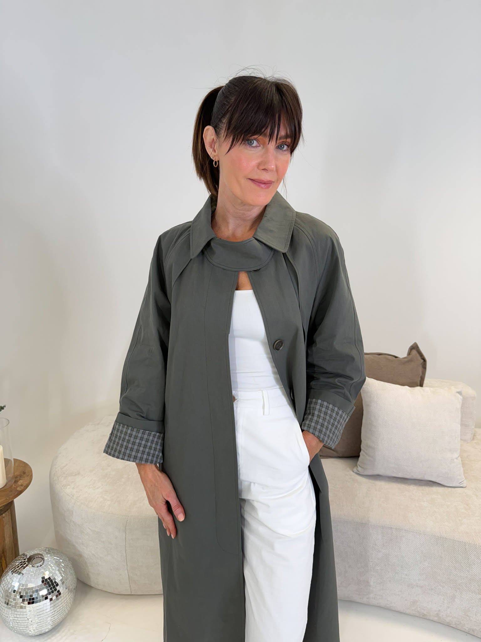 Trench coat in a grey with a fully lined interior. Sleeves are fully lined in contrasting check fabric, finished with wide turn-up cuffs for a statement detail.