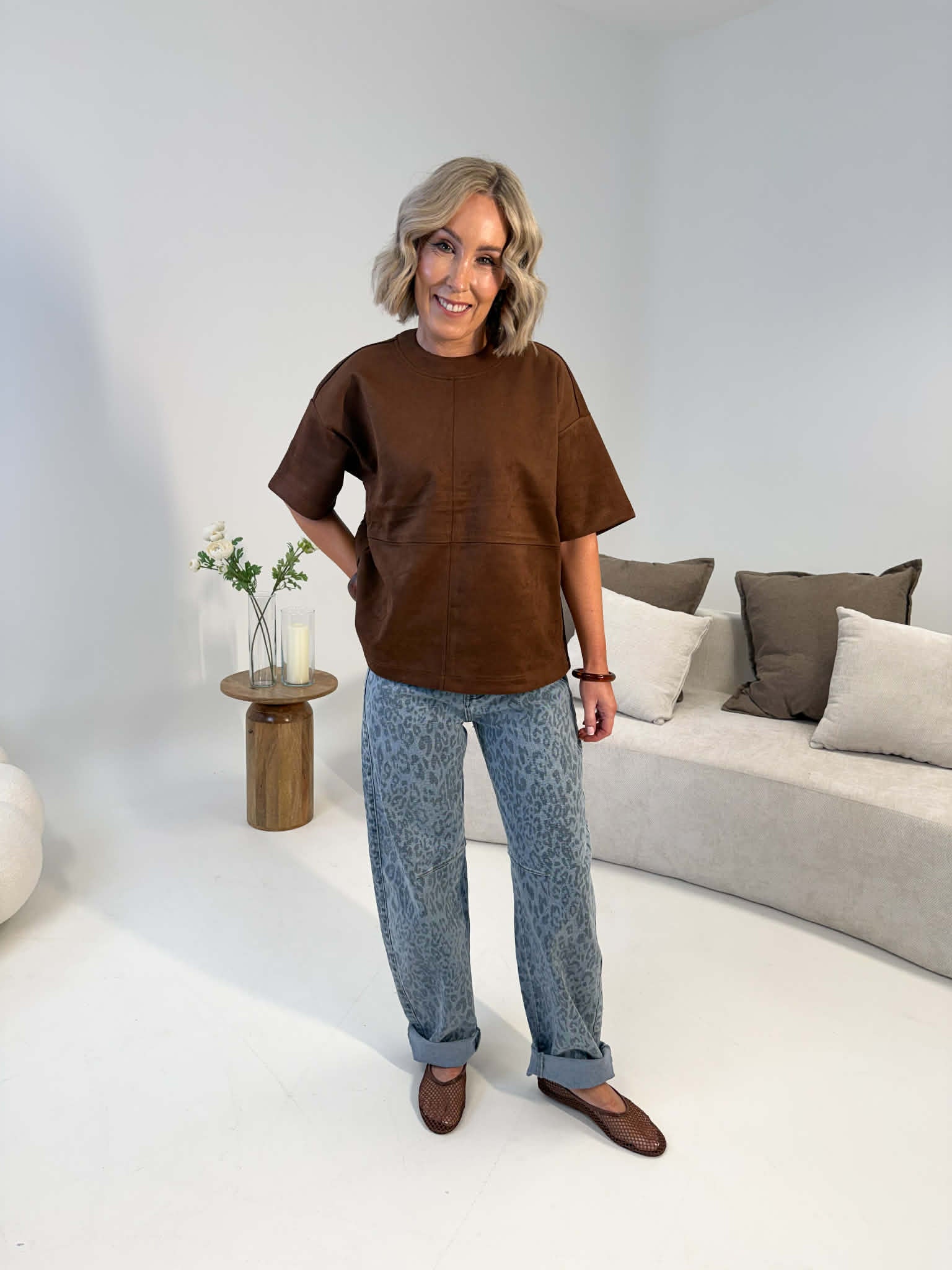 Boxy-fit tee in soft suede-effect fabric. Designed with panel detailing and a classic round neckline. Finished with a two-button closure at the back.