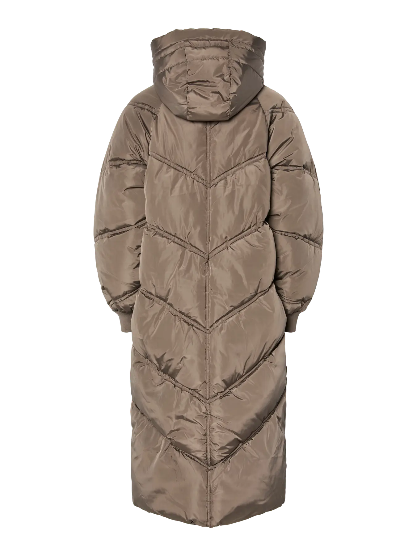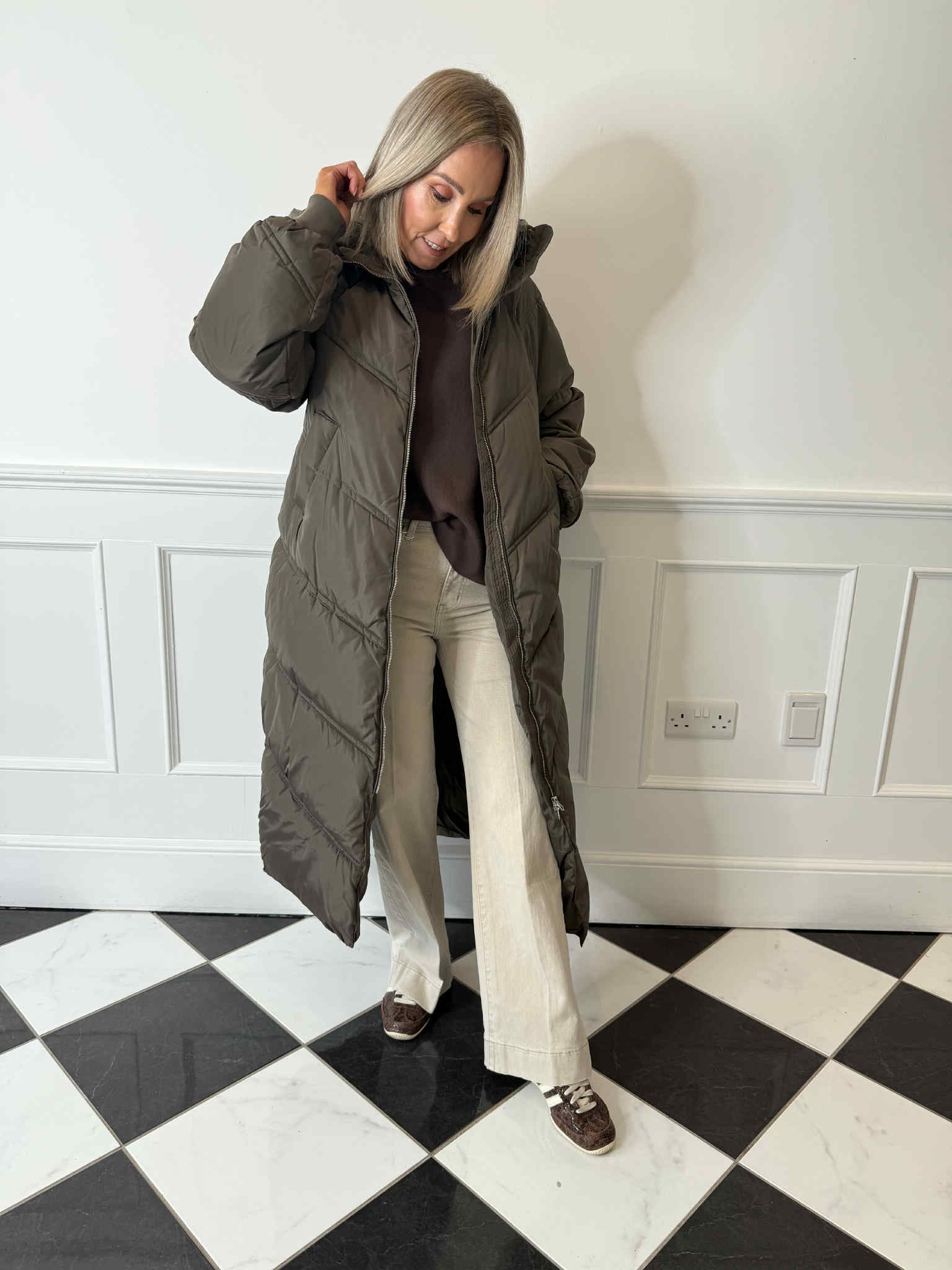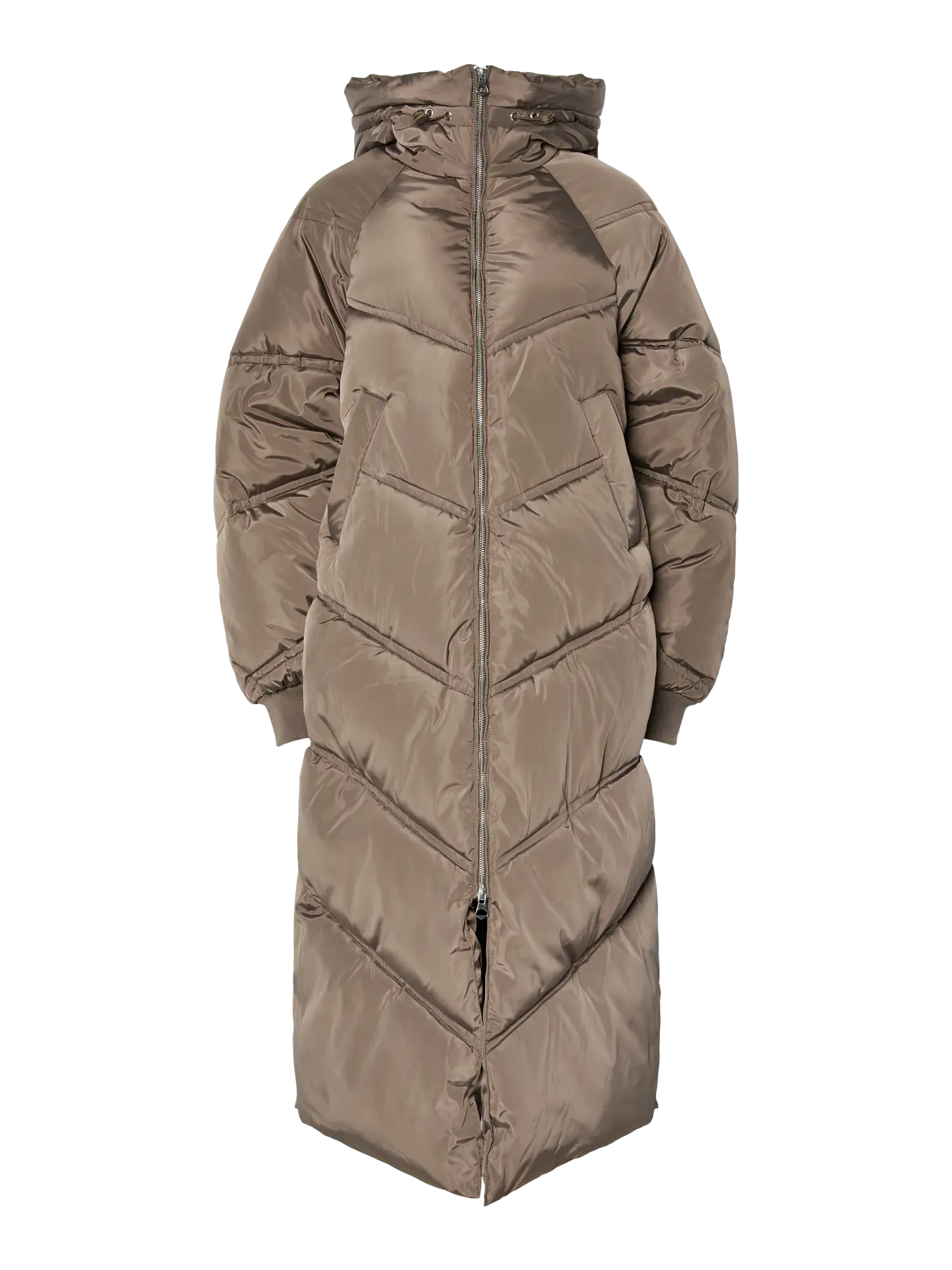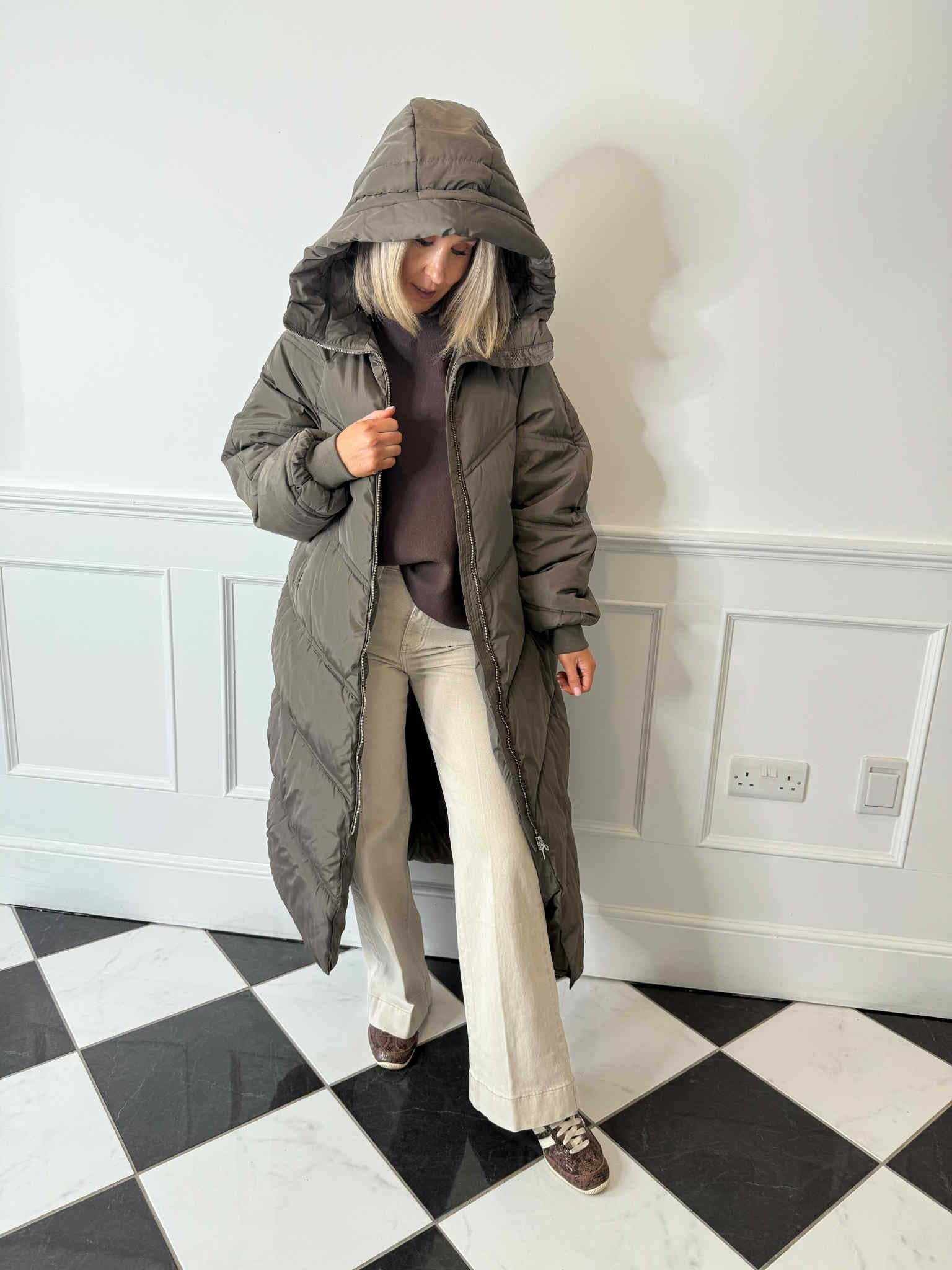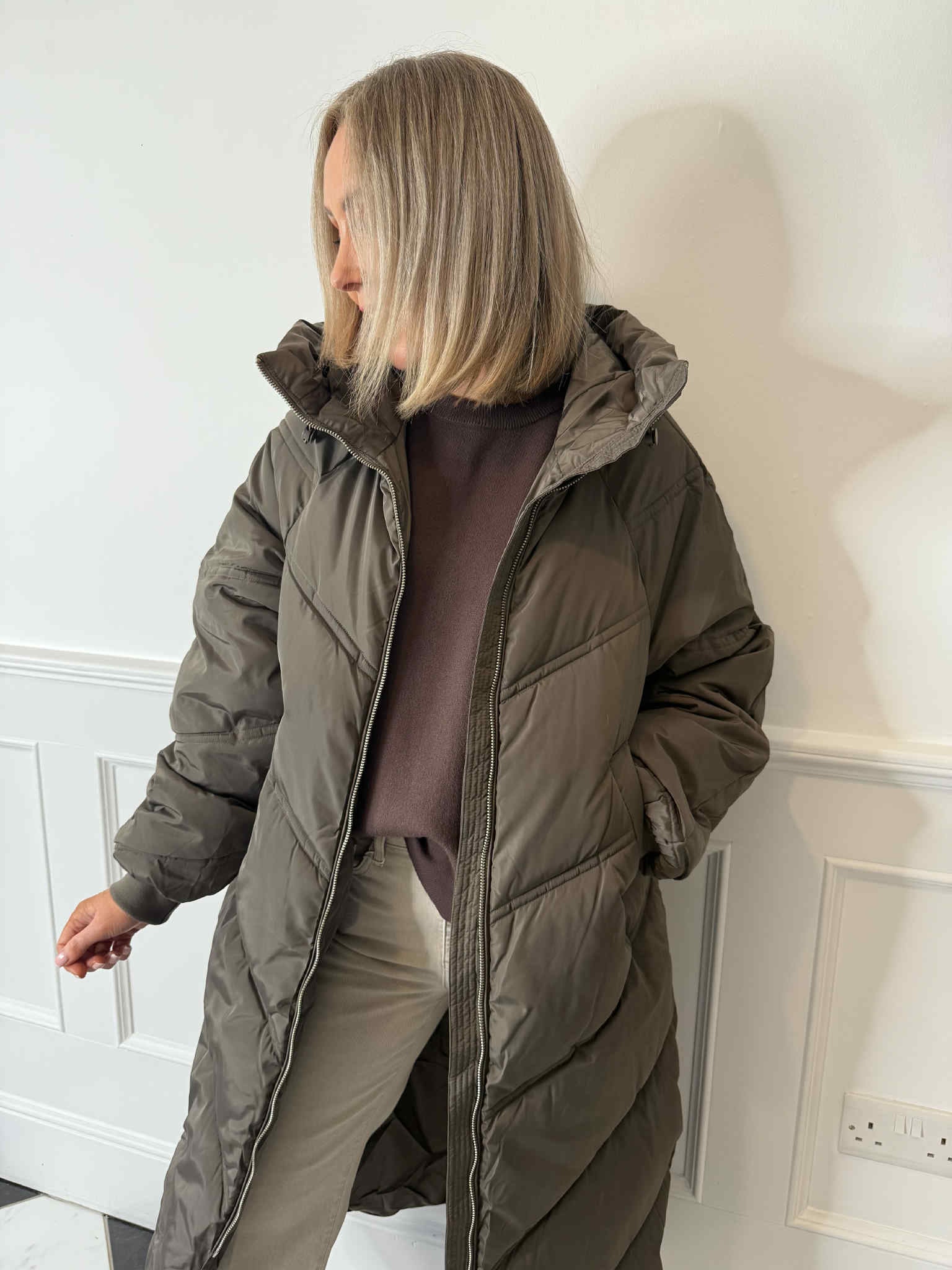 A contemporary essential for colder days. This long puffer coat features a high neck with hood, zip fastening, elasticated cuffs, and side pockets for practicality. Fully lined in soft polyester, it combines warmth with a sleek, structured silhouette.