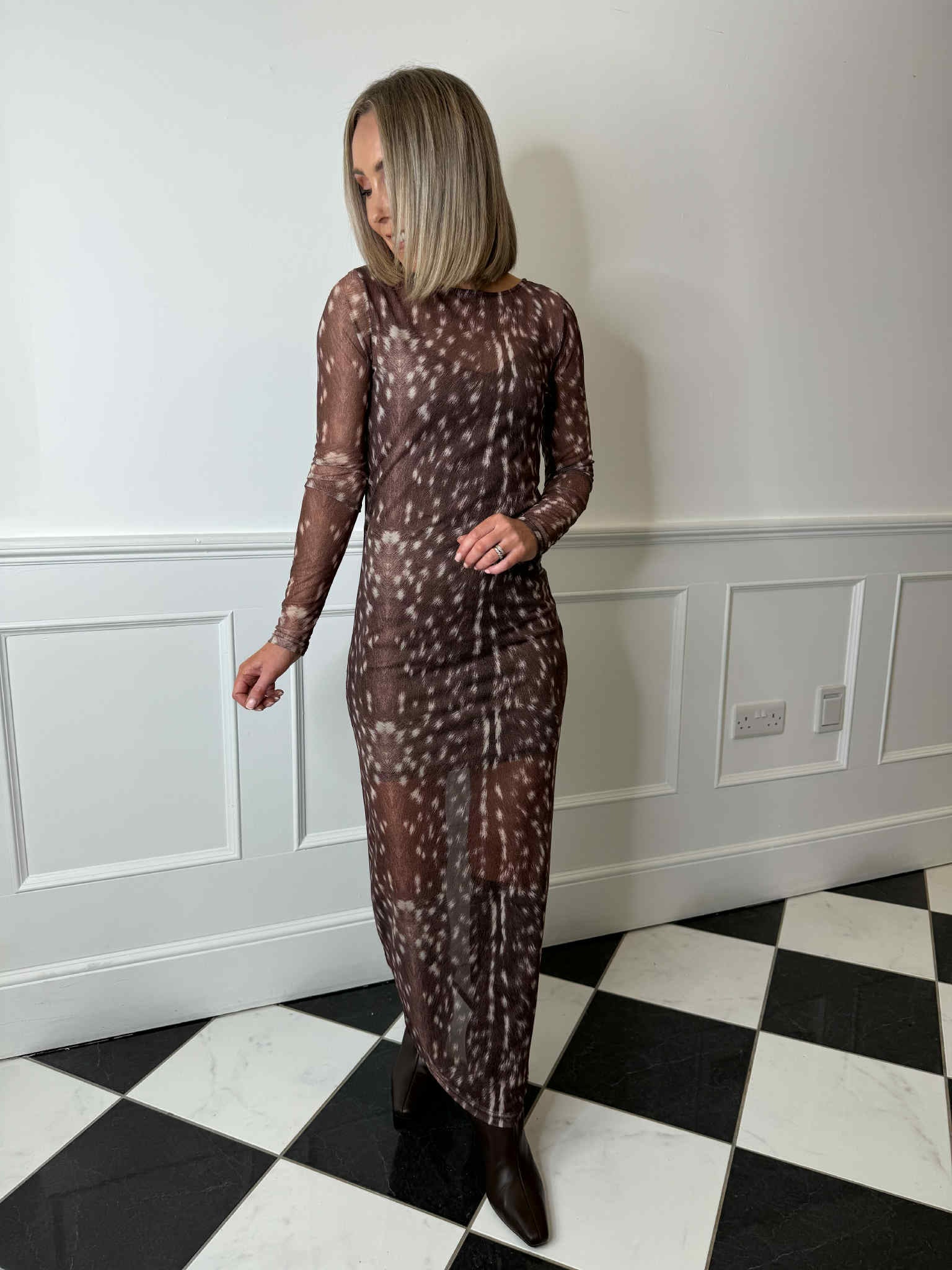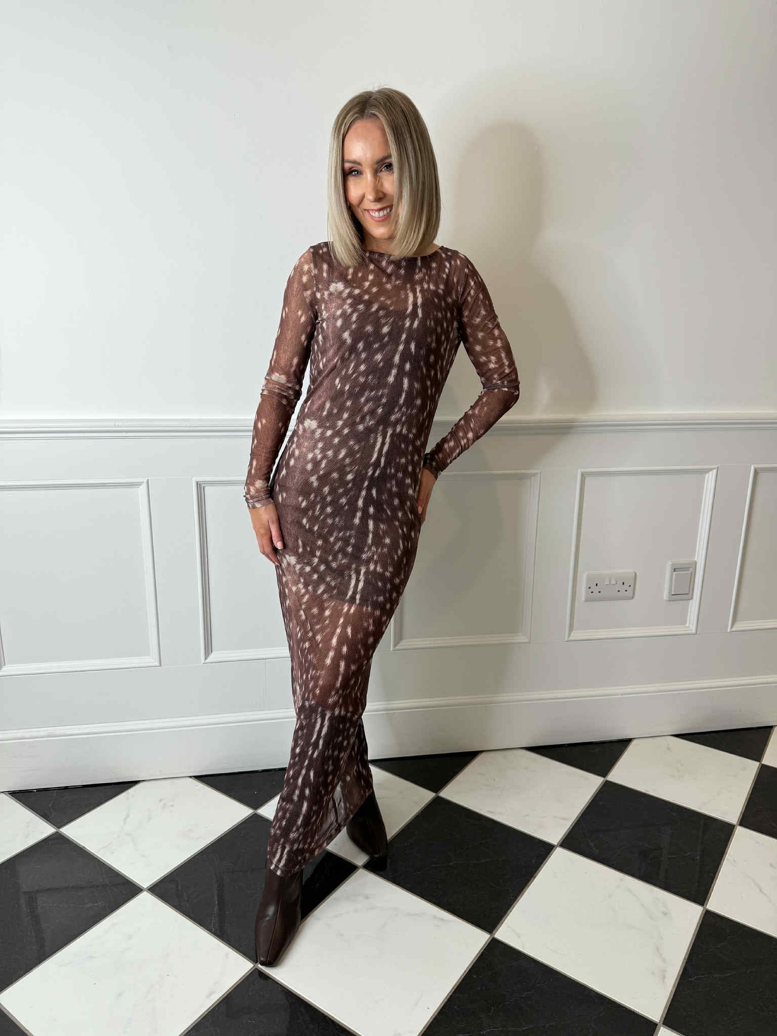 Make a statement in the Montana Long Mesh Dress, featuring an all-over deer print and a figure-flattering silhouette. The dress comes with a shorter, detachable underslip lining for versatile styling, and is crafted from 95% polyester and 5% elastane for comfort and stretch.