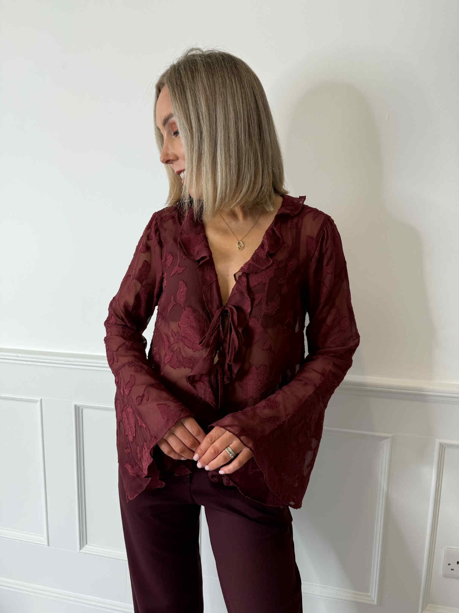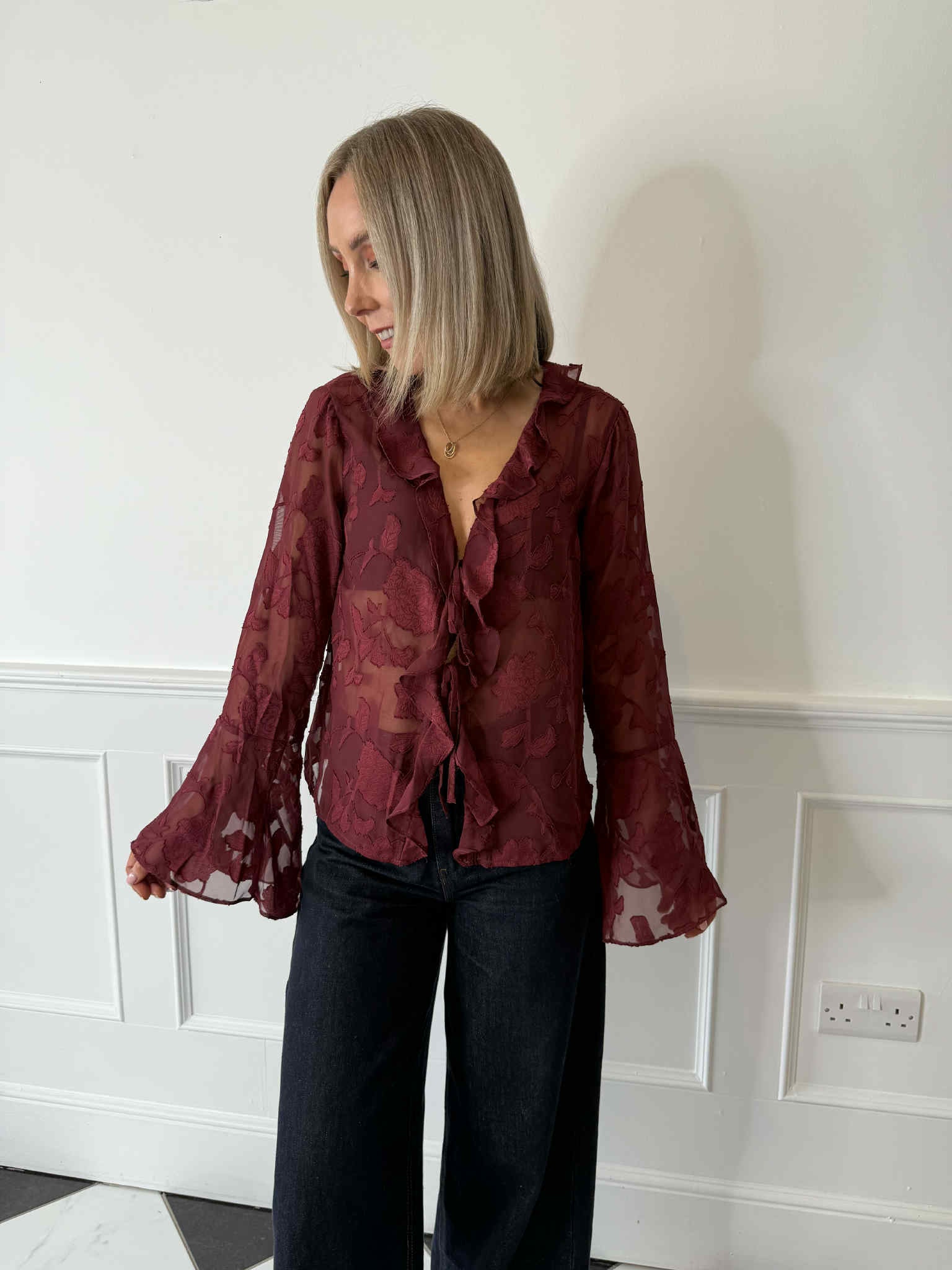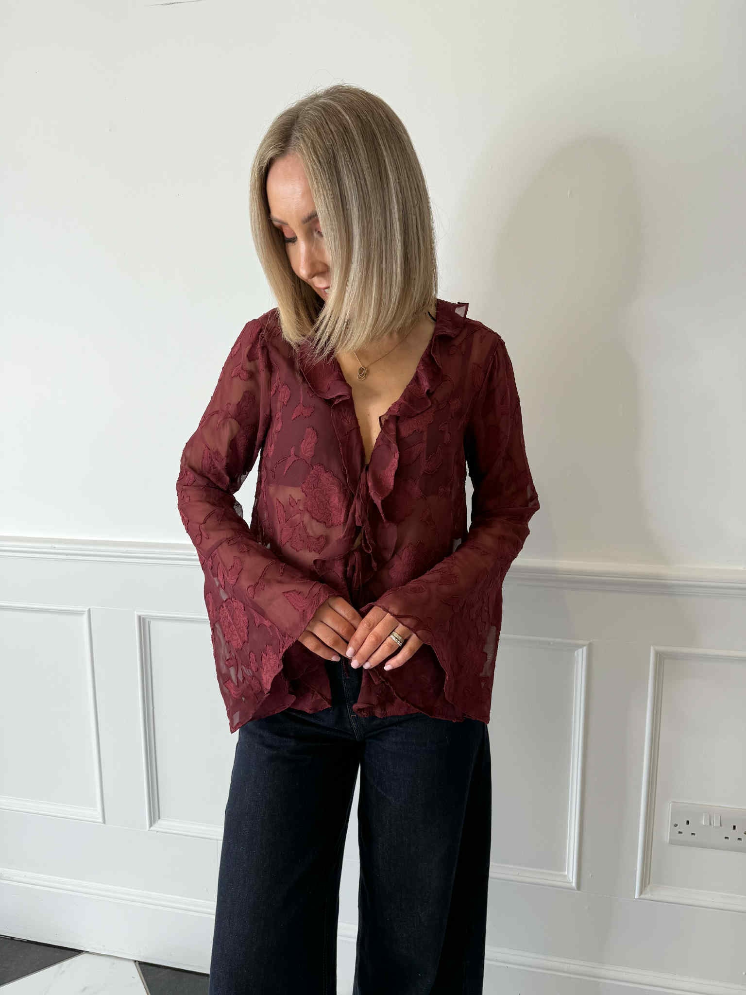 Feminine and refined, this sheer textured top features delicate embroidery, a frilled V-neckline, and long sleeves with flute cuffs. Finished with a tie front, it offers an effortlessly elegant silhouette in a regular fit.
