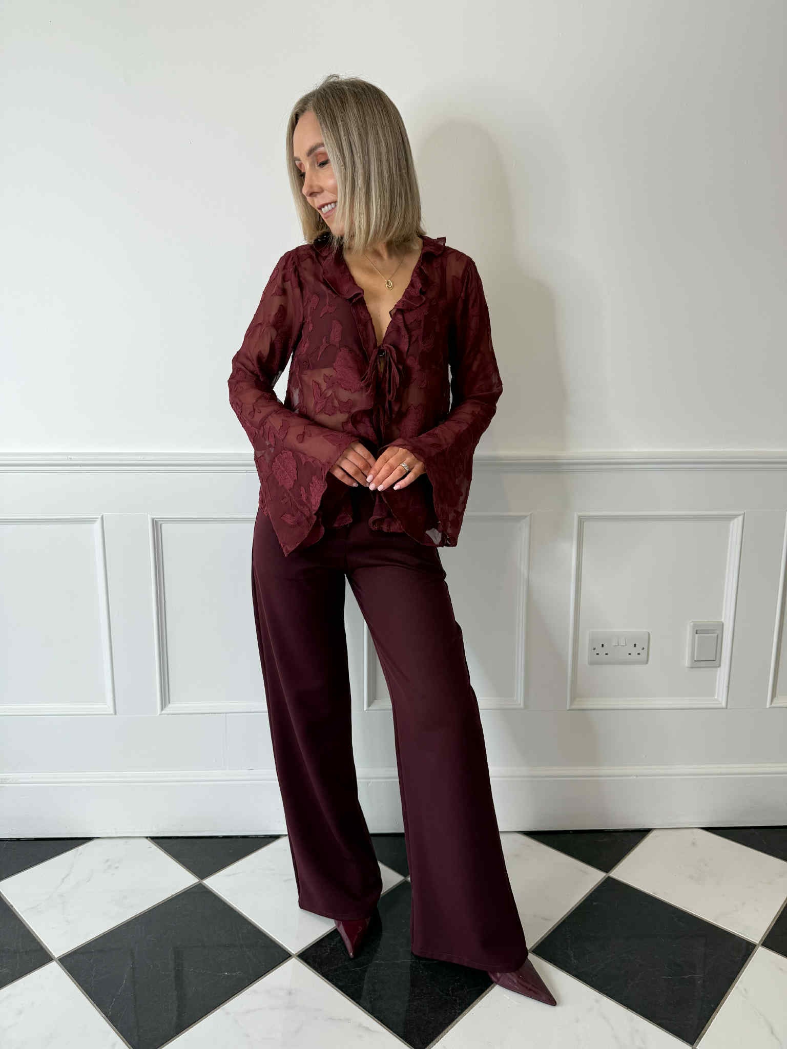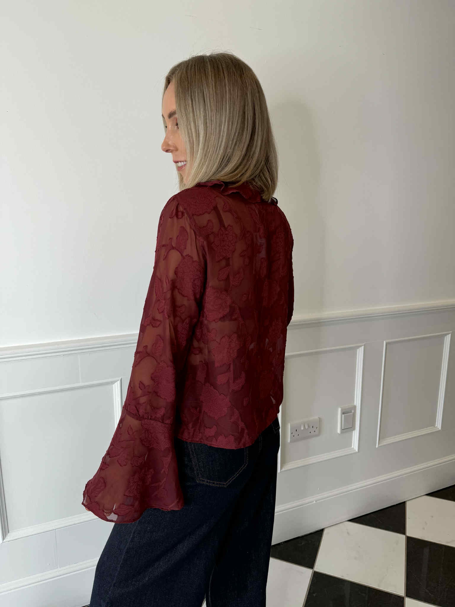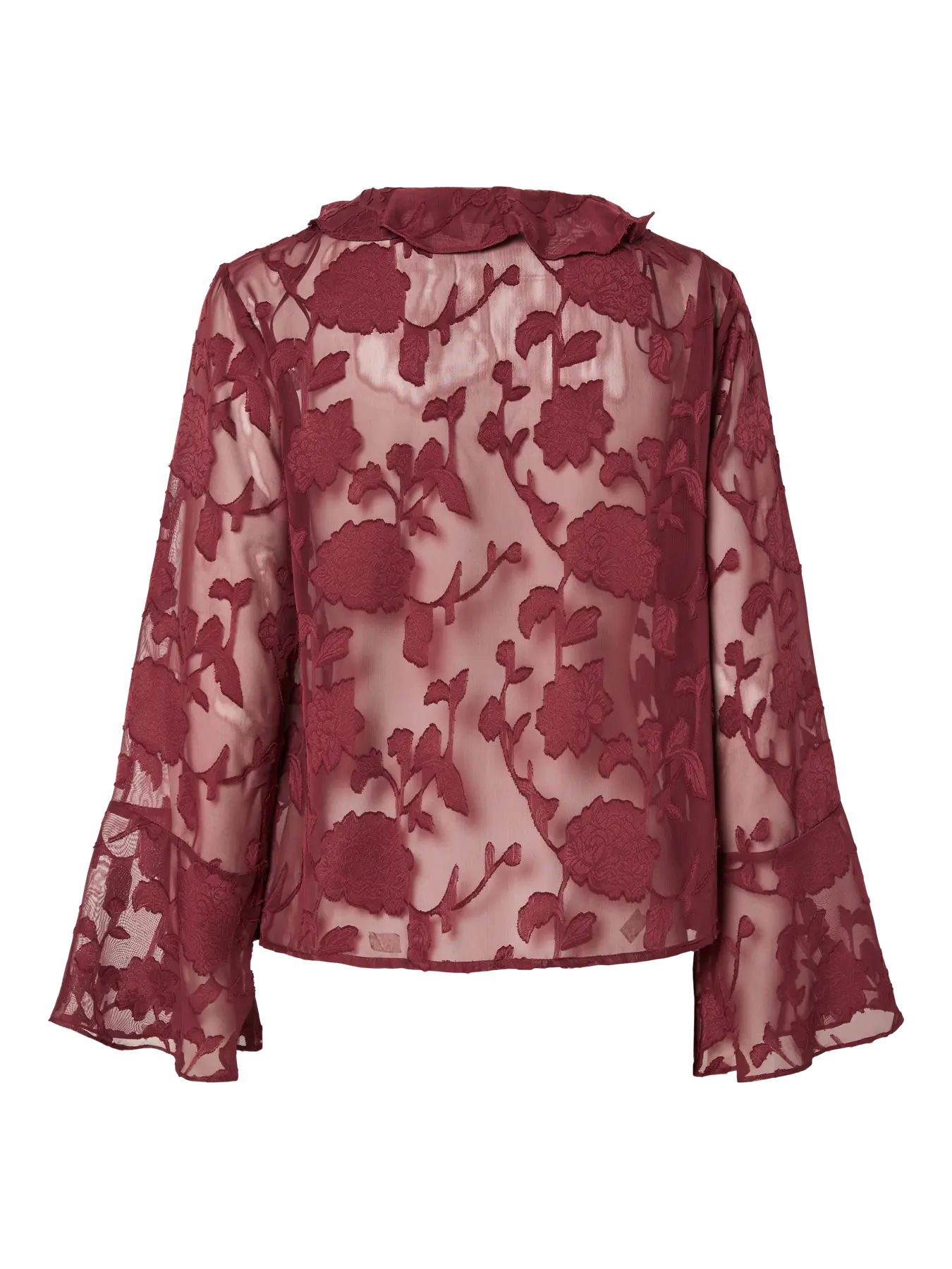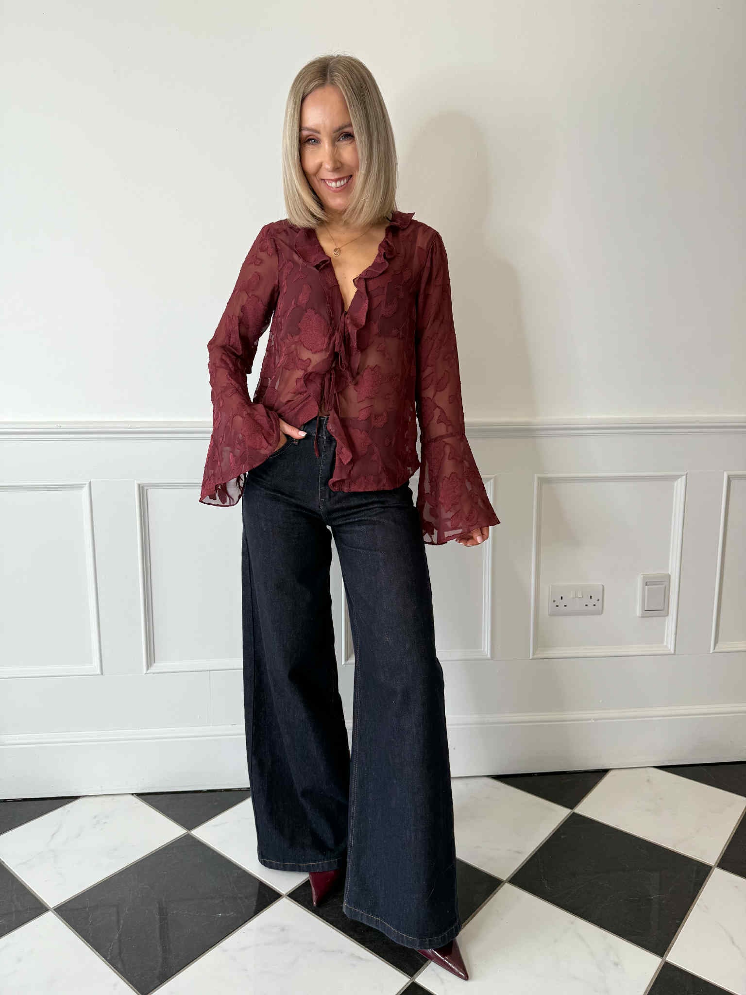 Feminine and refined, this sheer textured top features delicate embroidery, a frilled V-neckline, and long sleeves with flute cuffs. Finished with a tie front, it offers an effortlessly elegant silhouette in a regular fit.