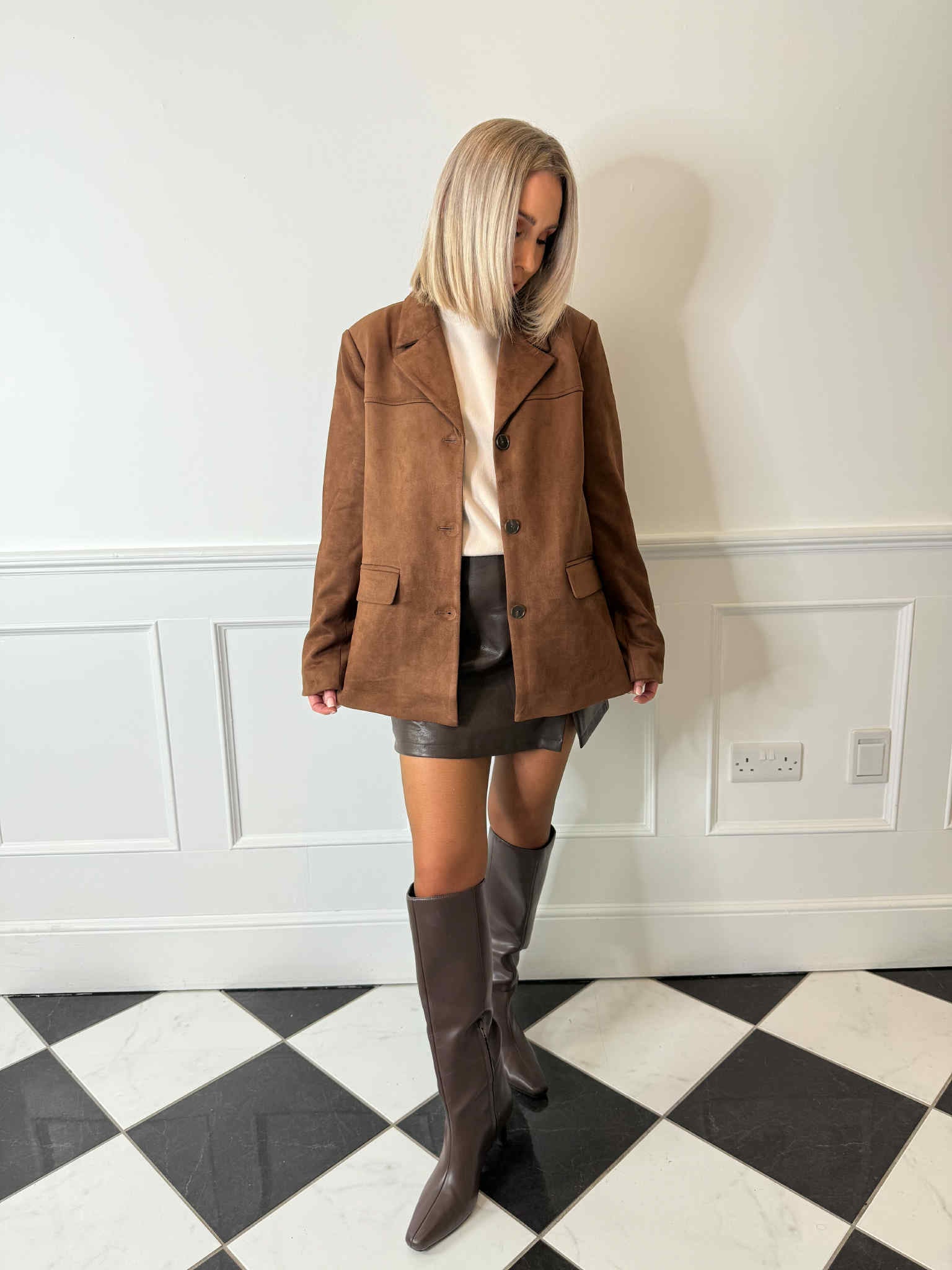 Soft suede, clean tailoring. Effortless over knits, tees, or tailored pieces: Sinead styled it with the Reo PU Leather Skort, sheer tights, and boots for a chic day-to-night look.