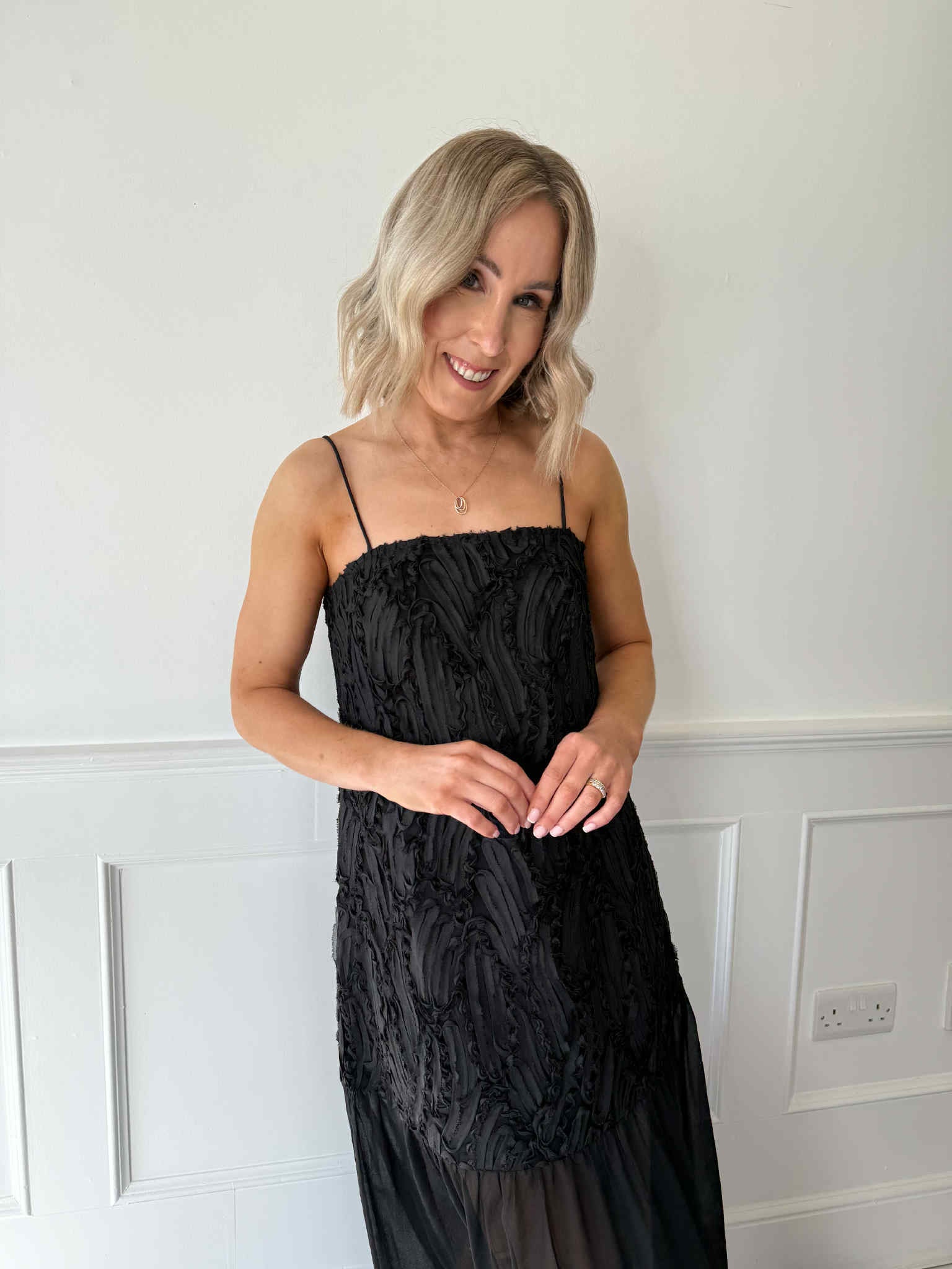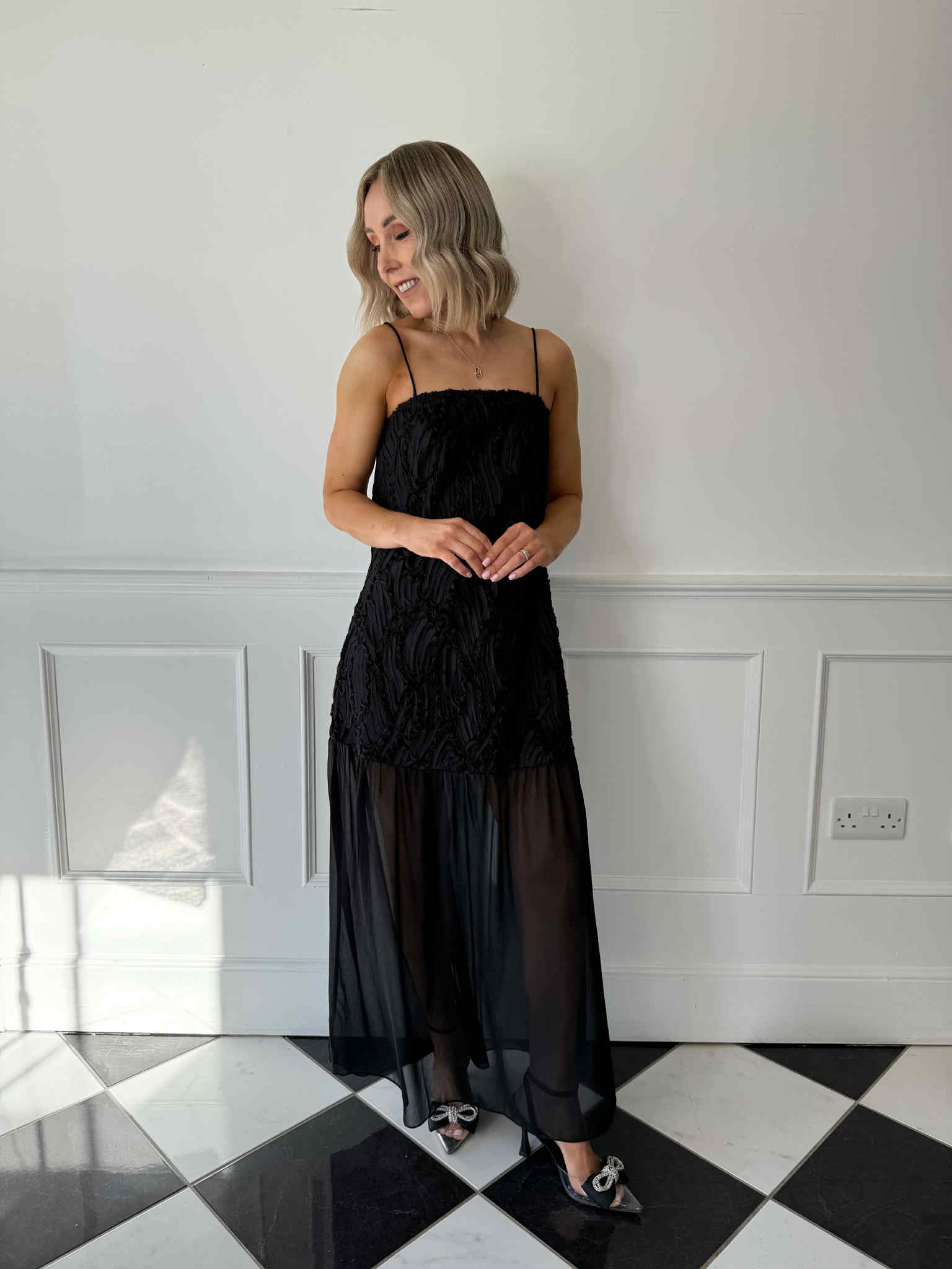 Effortless elegance meets modern design. This maxi dress features a contrasting textured top and a sheer flowing skirt, finished with adjustable straps and a concealed side zip. Designed in a regular fit, it’s the perfect choice for evening events or special occasions.