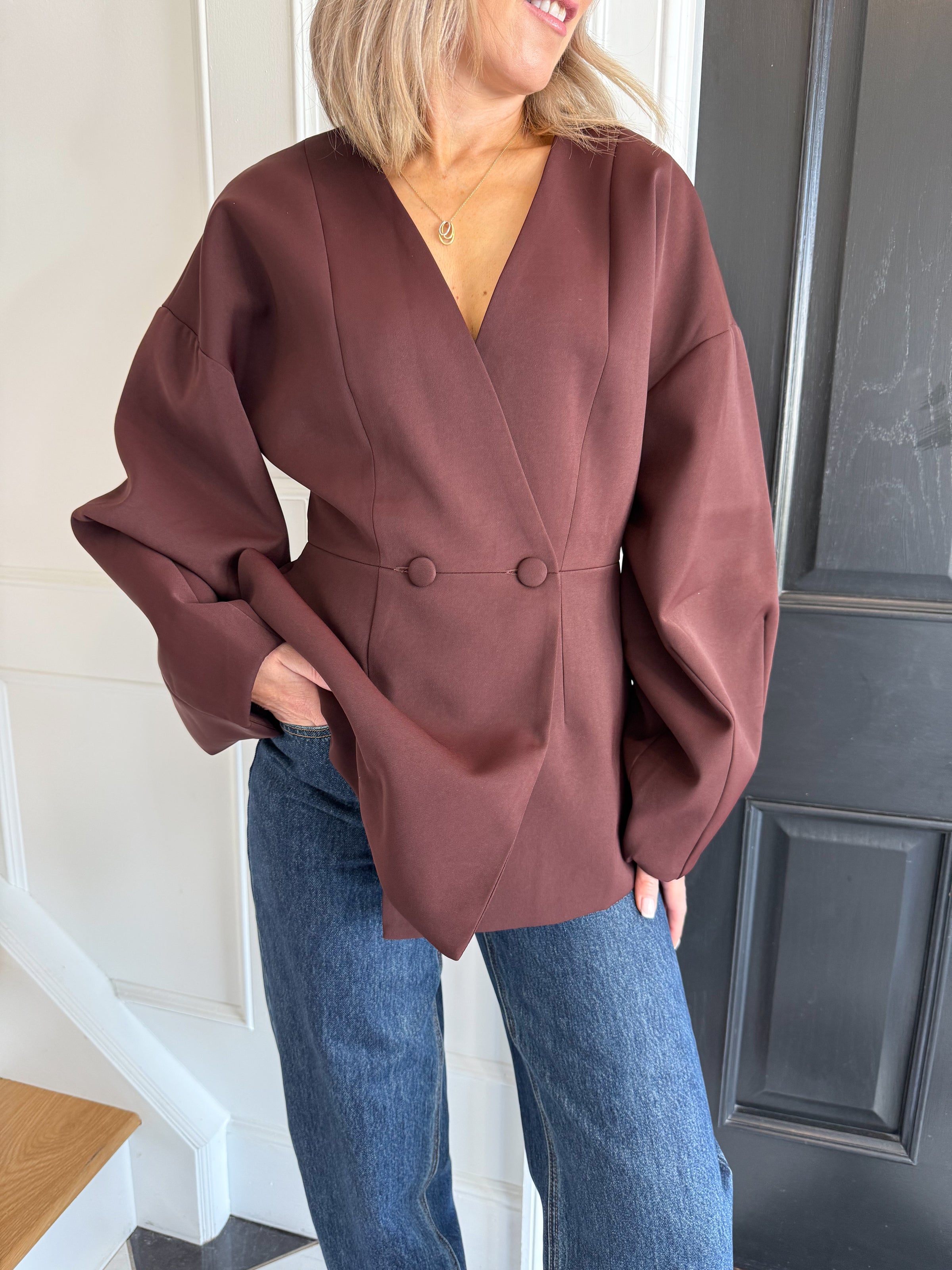 Tori Collarless Balloon Sleeve Blazer - Burgundy