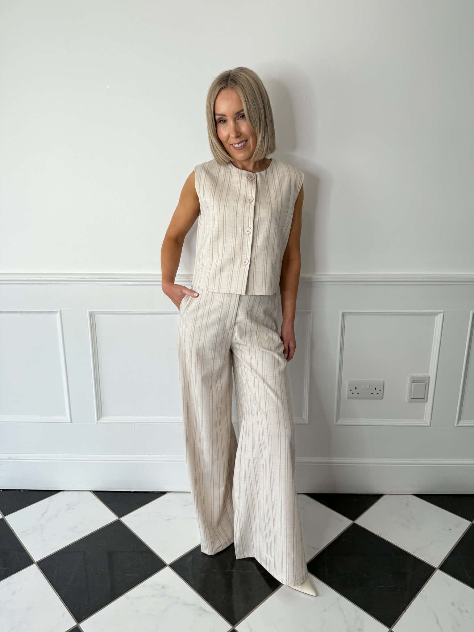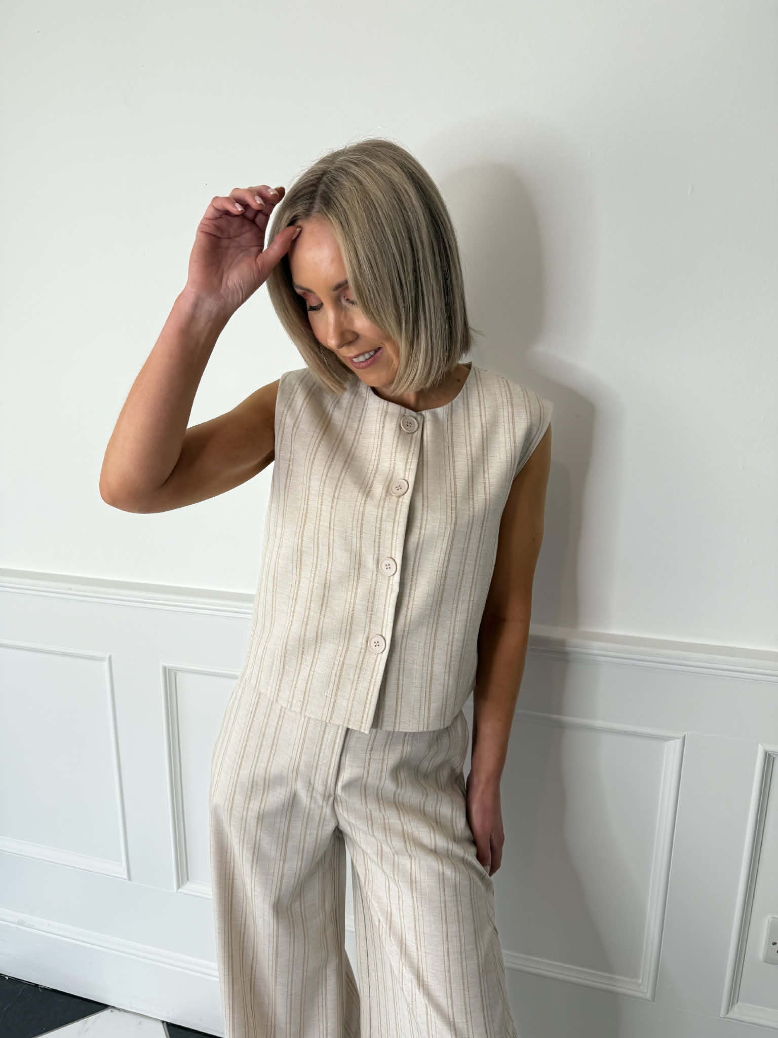 Waistcoat in a soft oatmeal coloured fabric with a subtle pinstripe finish. Featuring a round neckline and a four-button fastening at the front. Sleeveless design with a tailored silhouette.