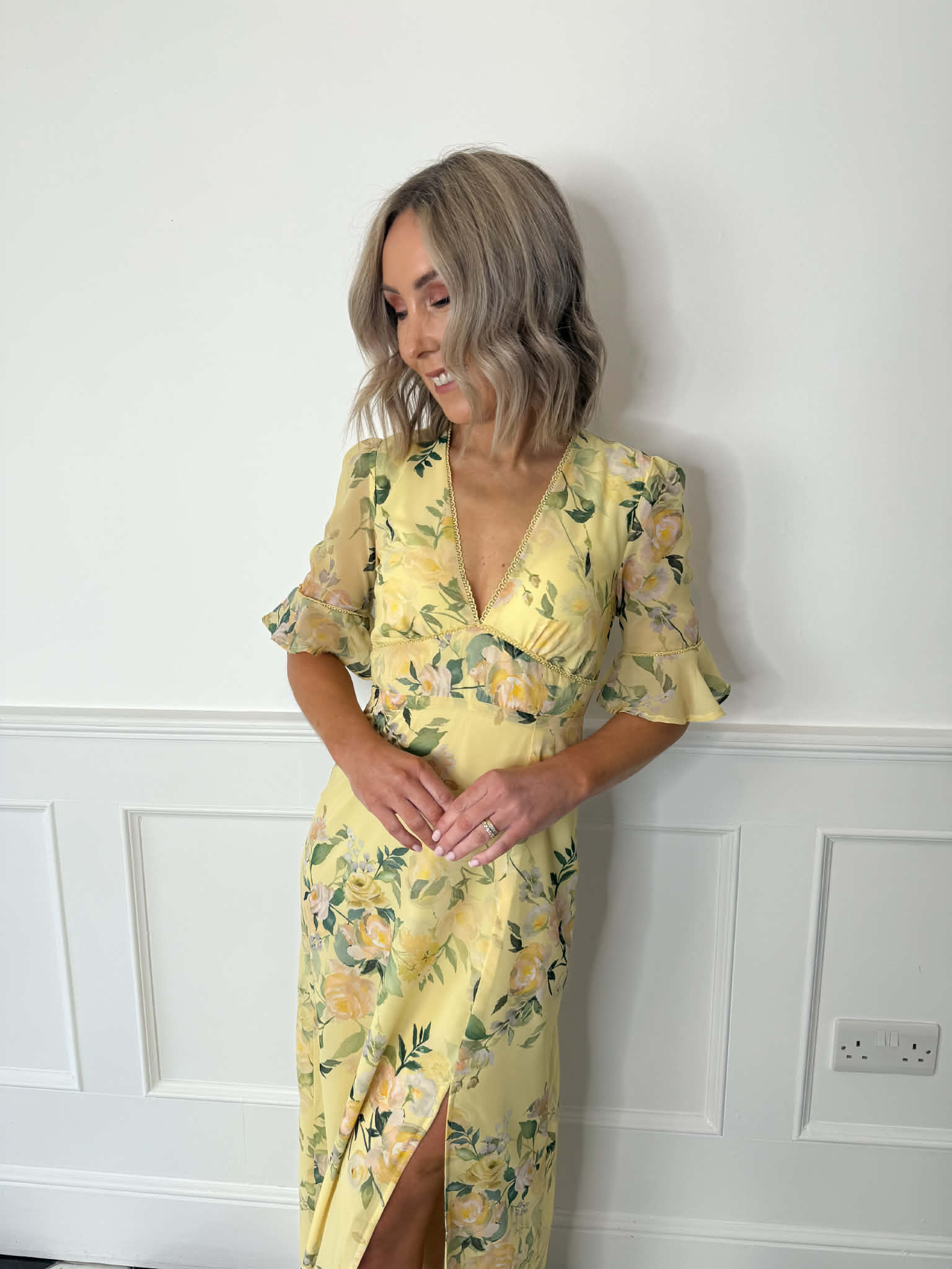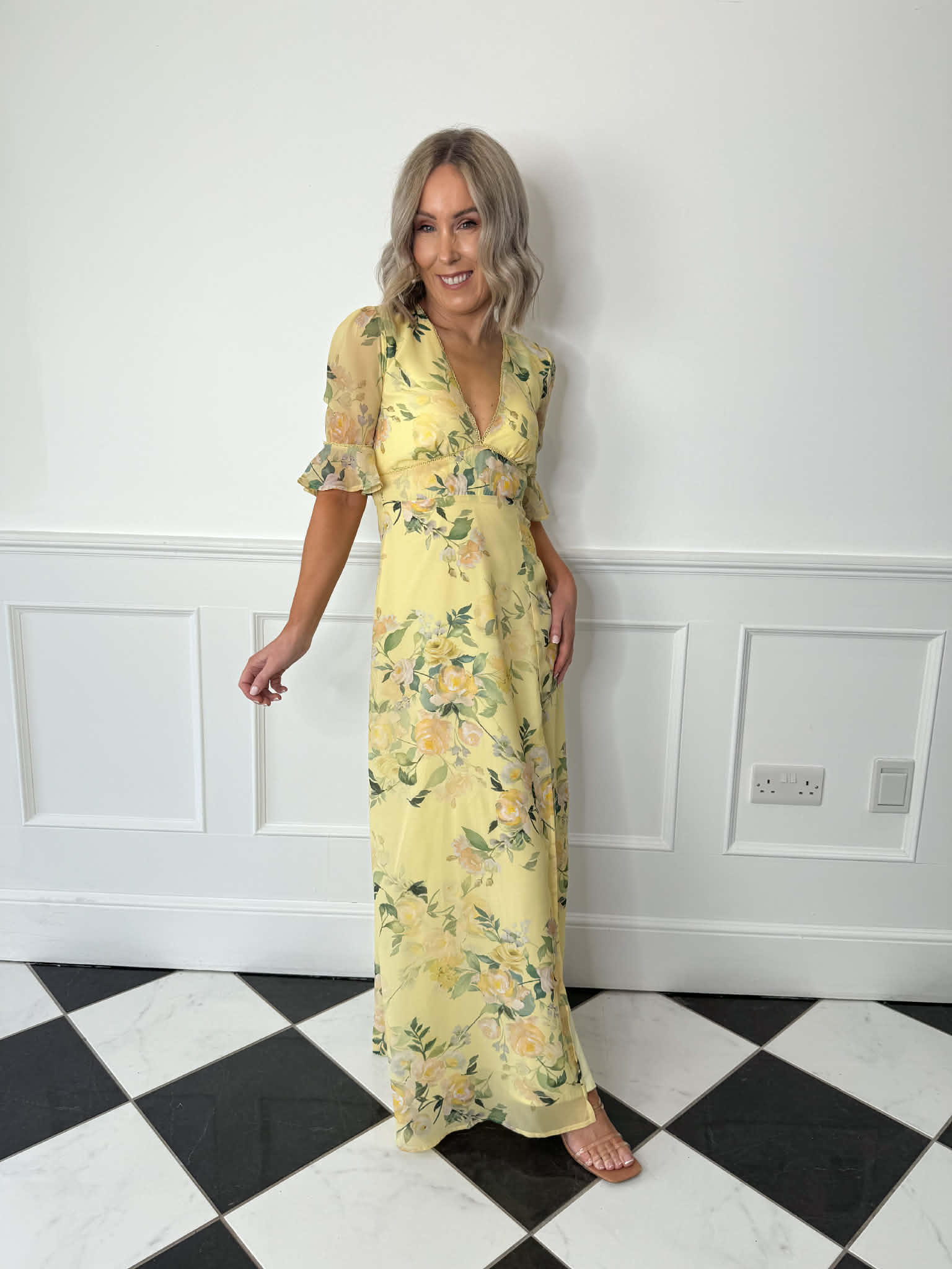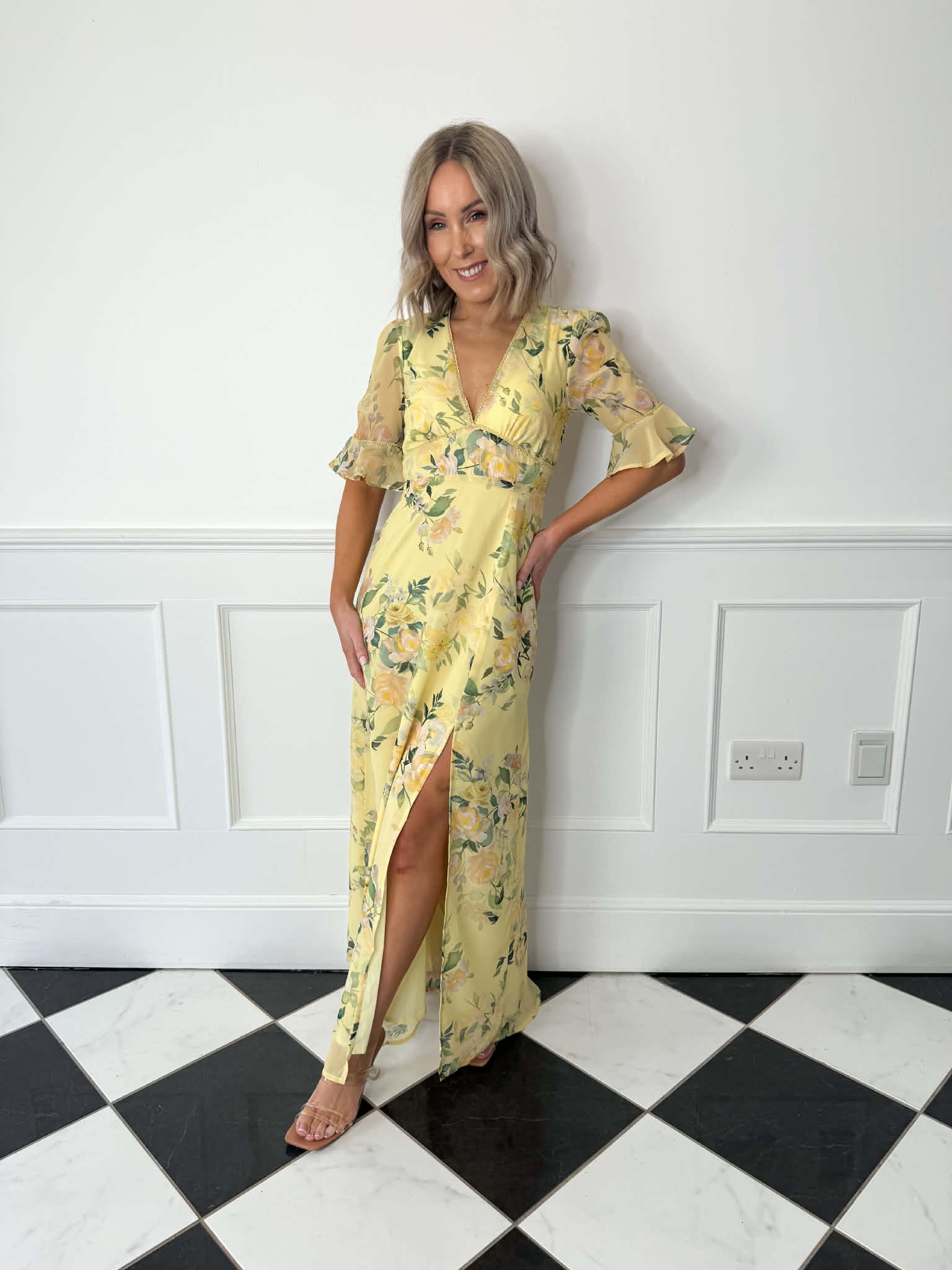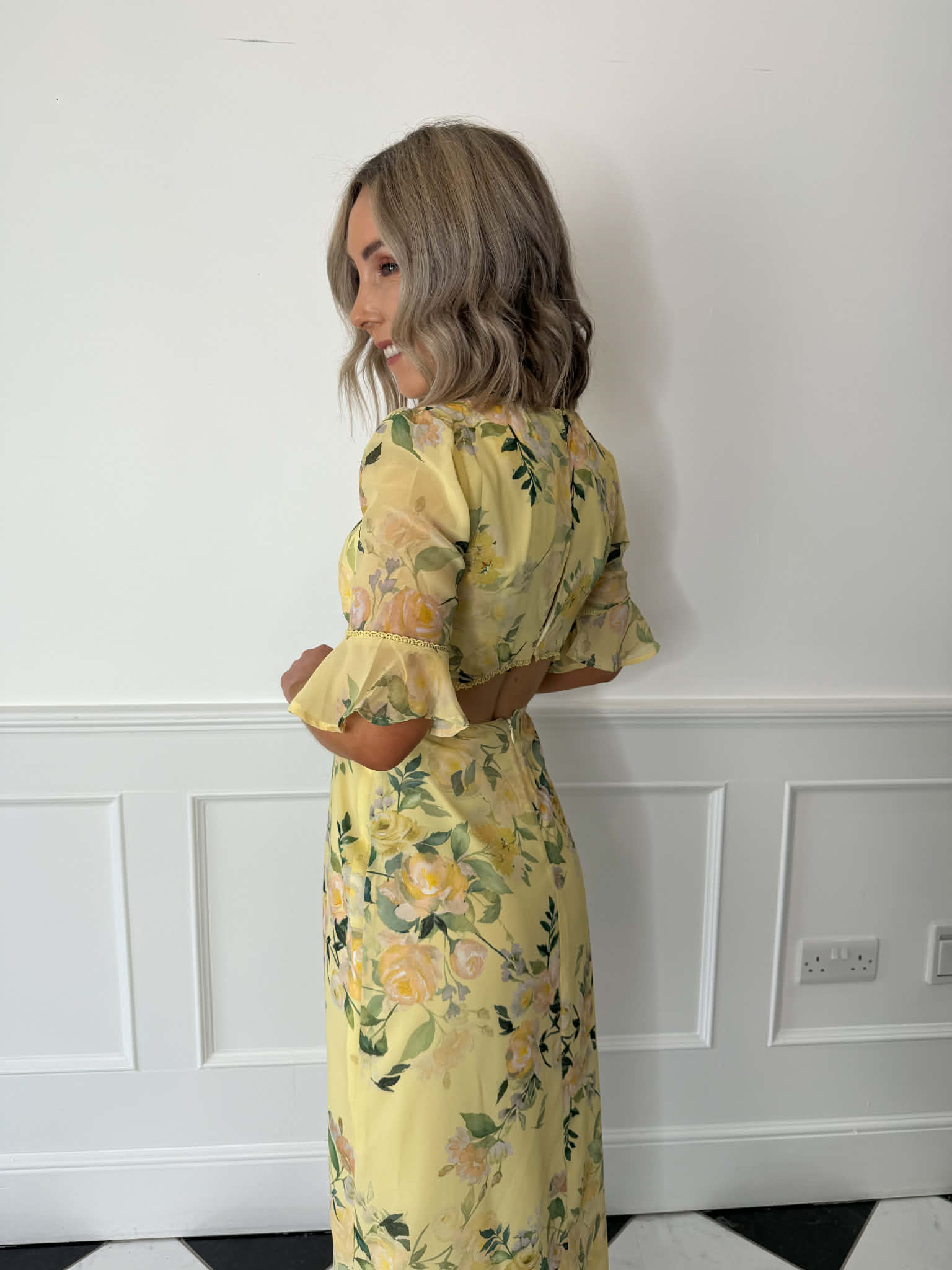 Bright, feminine and full of spring energy, The Goldie is designed to make an impression from the very first wear. Frill sleeves and an open back detail bring soft romance, while the front split adds movement. In a yellow multi print that captures the colours of spring, this maxi is made for those feel good moments in the diary.