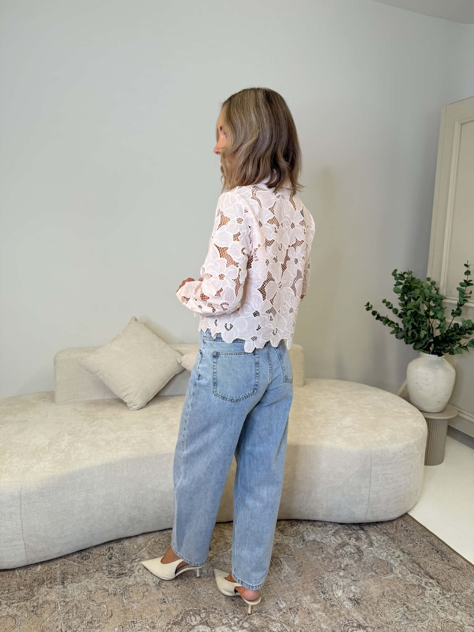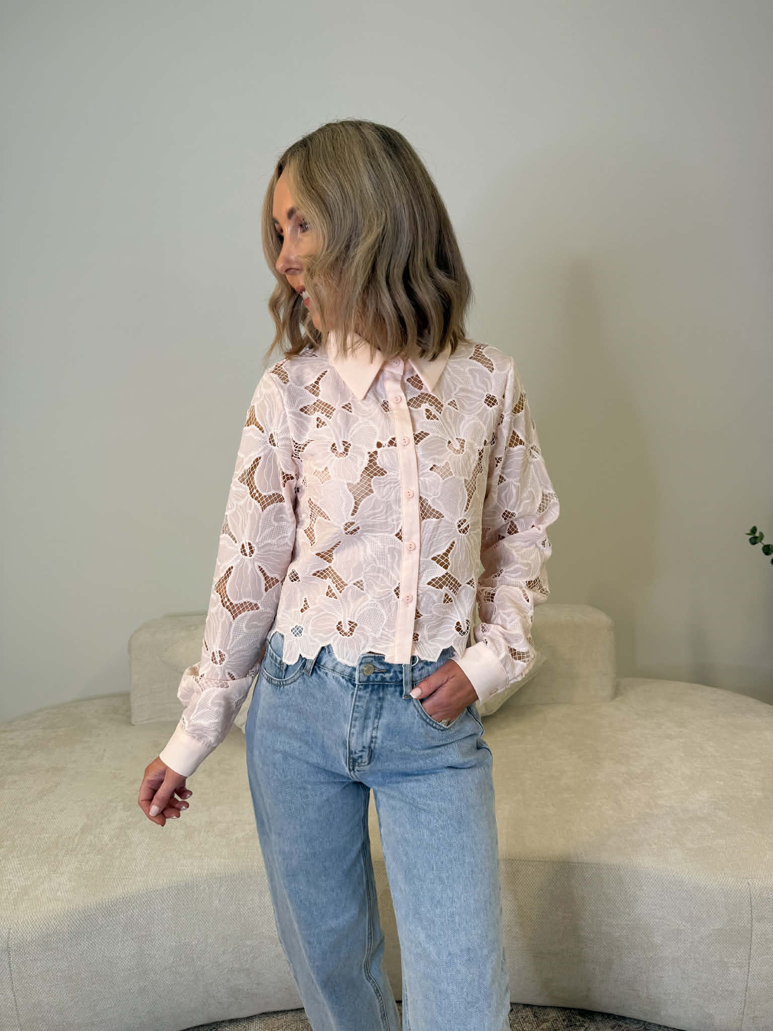 Designed in a sheer floral panelled mesh, this blouse brings texture and detail while keeping the silhouette light and feminine. It features a classic collar and cuffs for a polished finish, with a buttoned-up front for versatile styling.