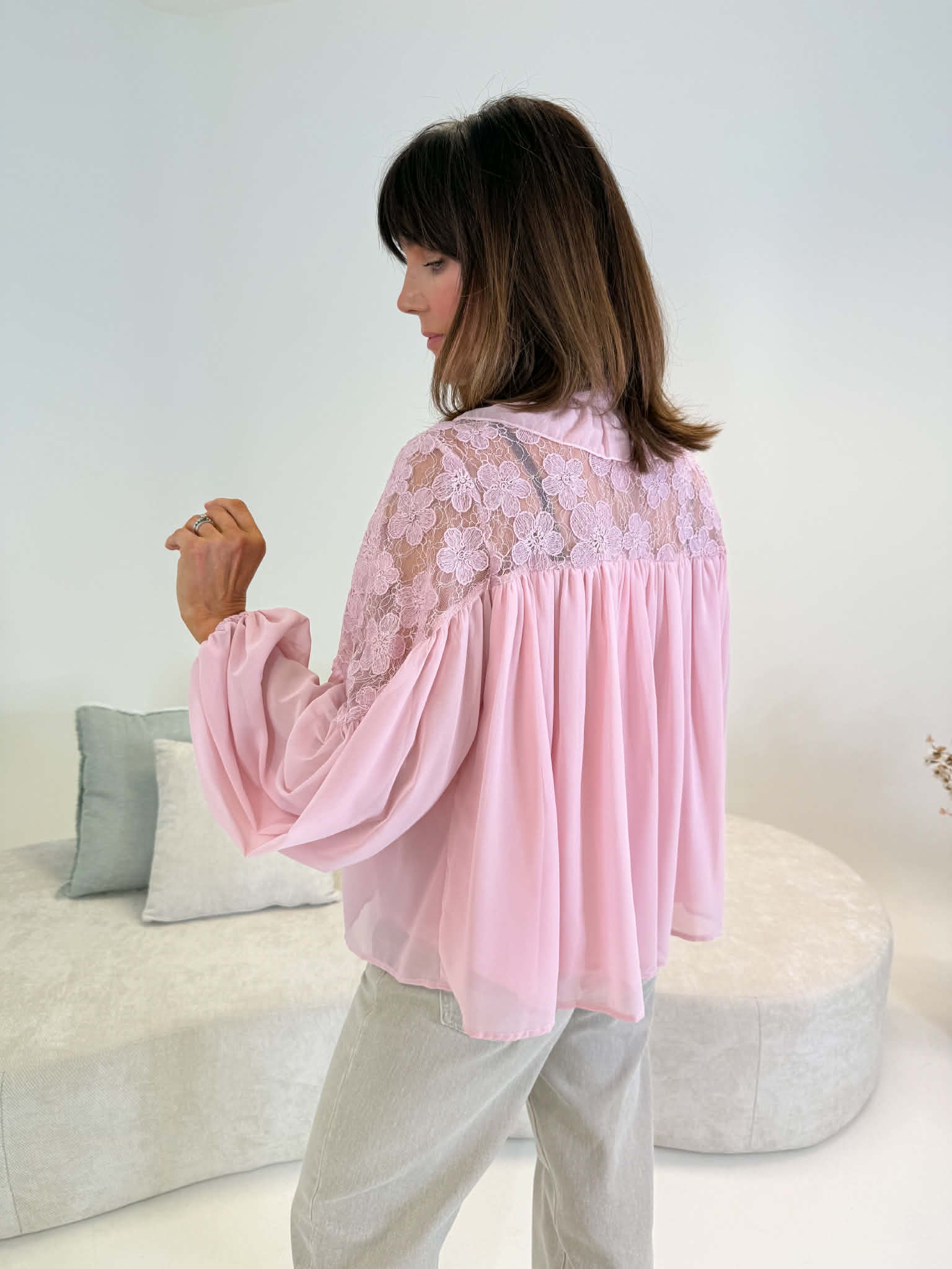 Soft pastel pink blouse with a sheer overlay and full lining, detailed with intricate lace panels. Designed with a ruffled high neckline, tie detail, and lace trim across the neck and shoulders for a romantic, elevated feel.