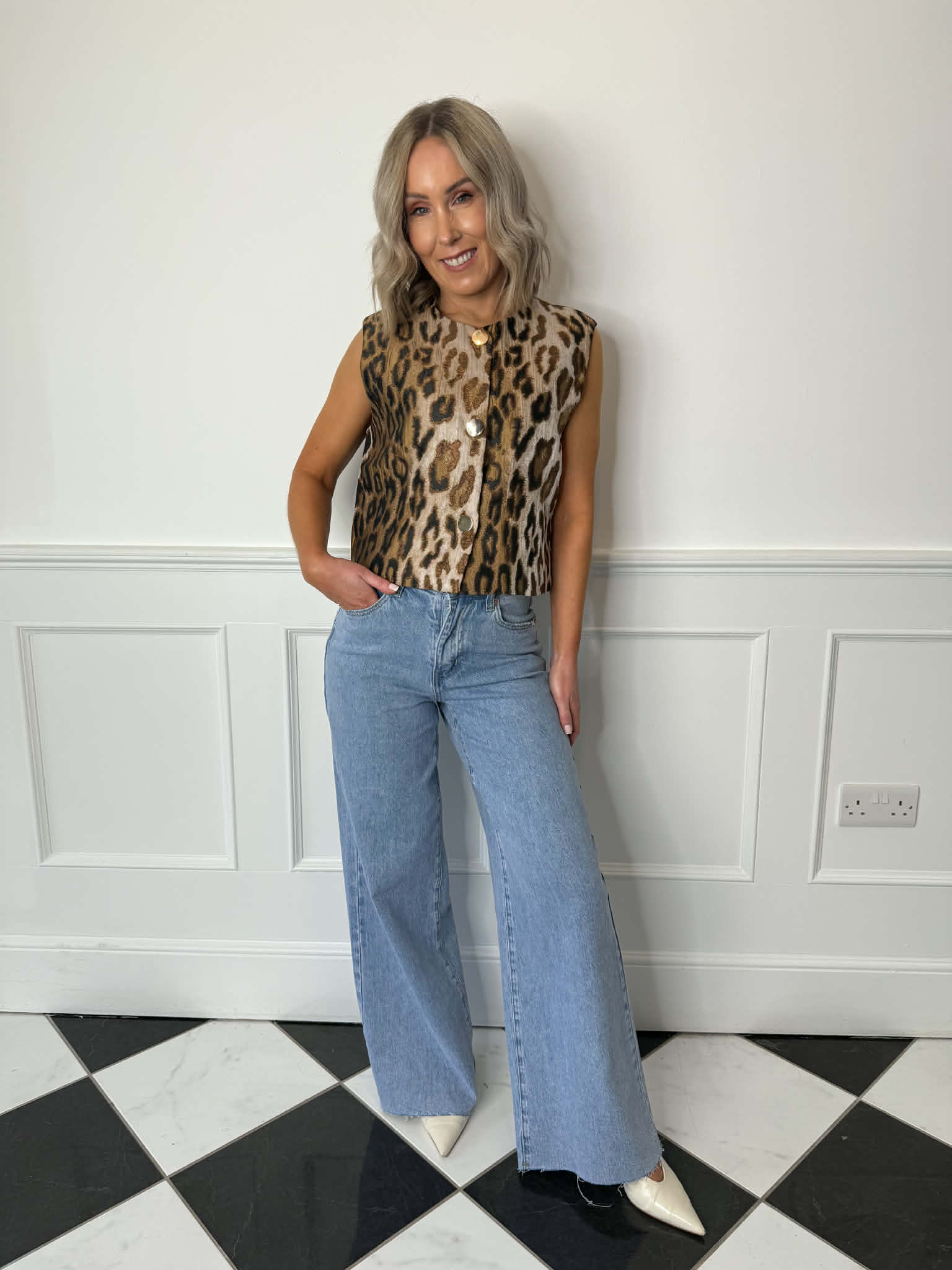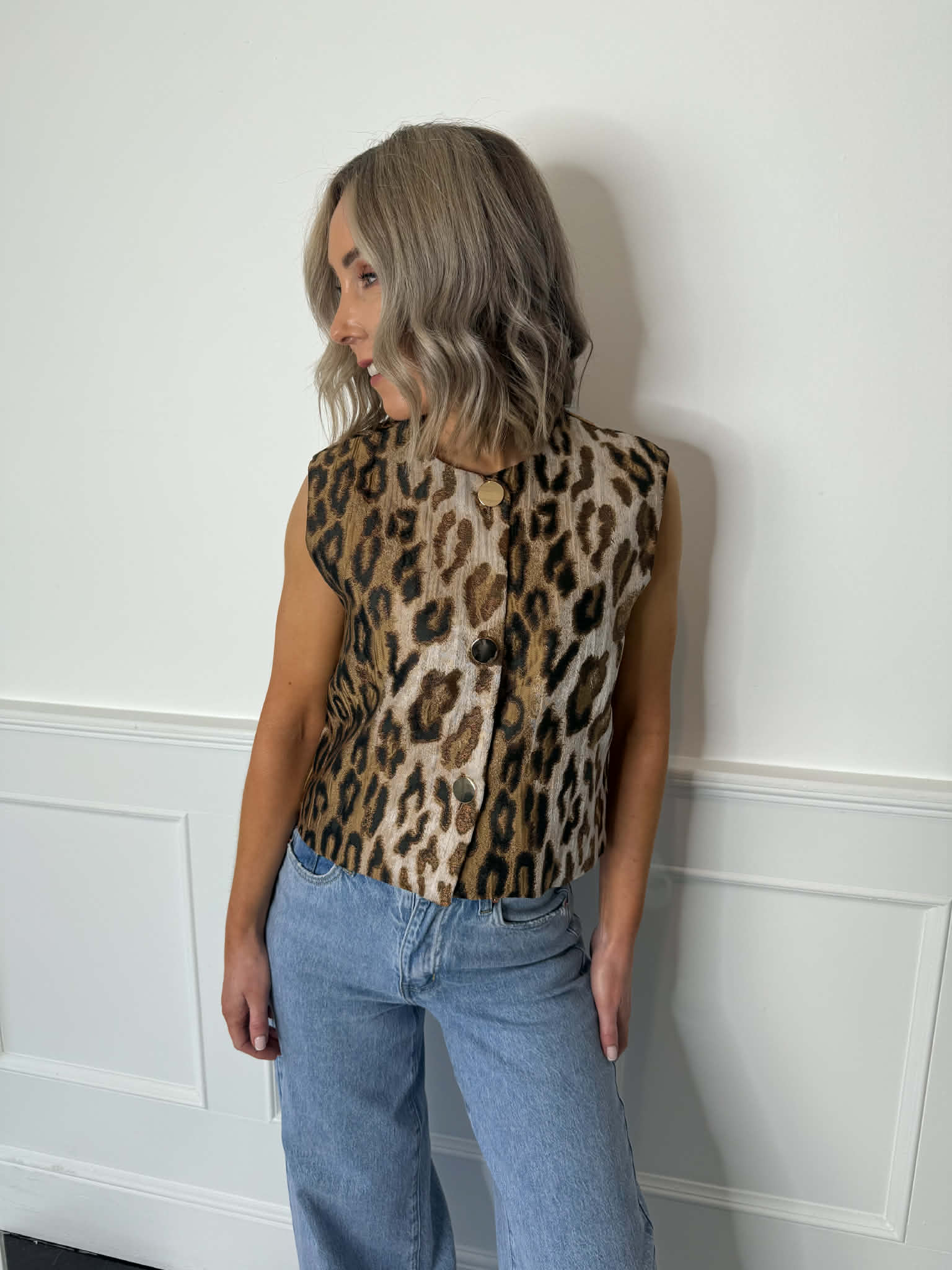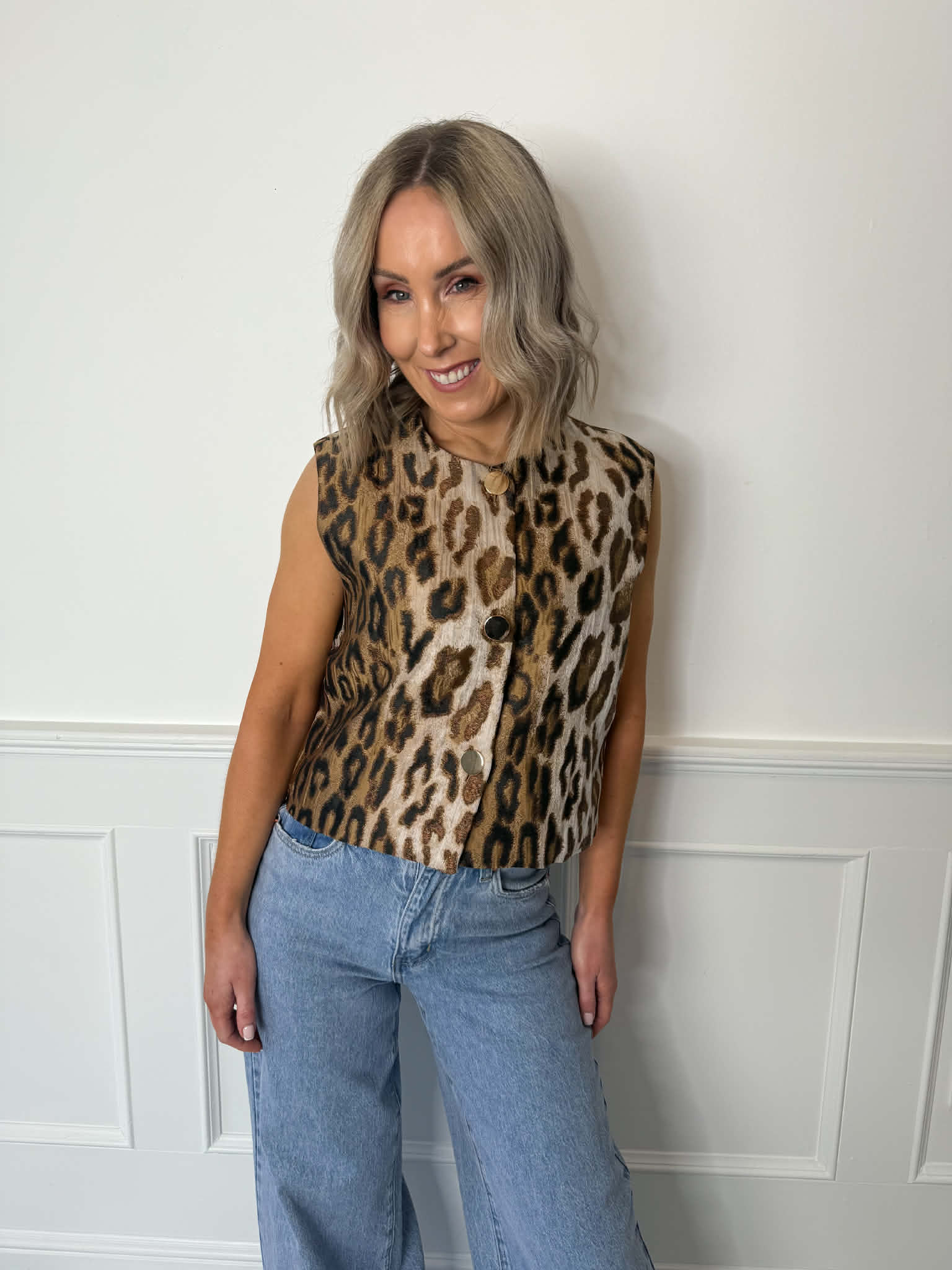 Add instant edge to any outfit with this leopard print waistcoat. Featuring a relaxed fit and glossy gold buttons, it’s the perfect mix of bold and chic. Layer it, love it, own it.