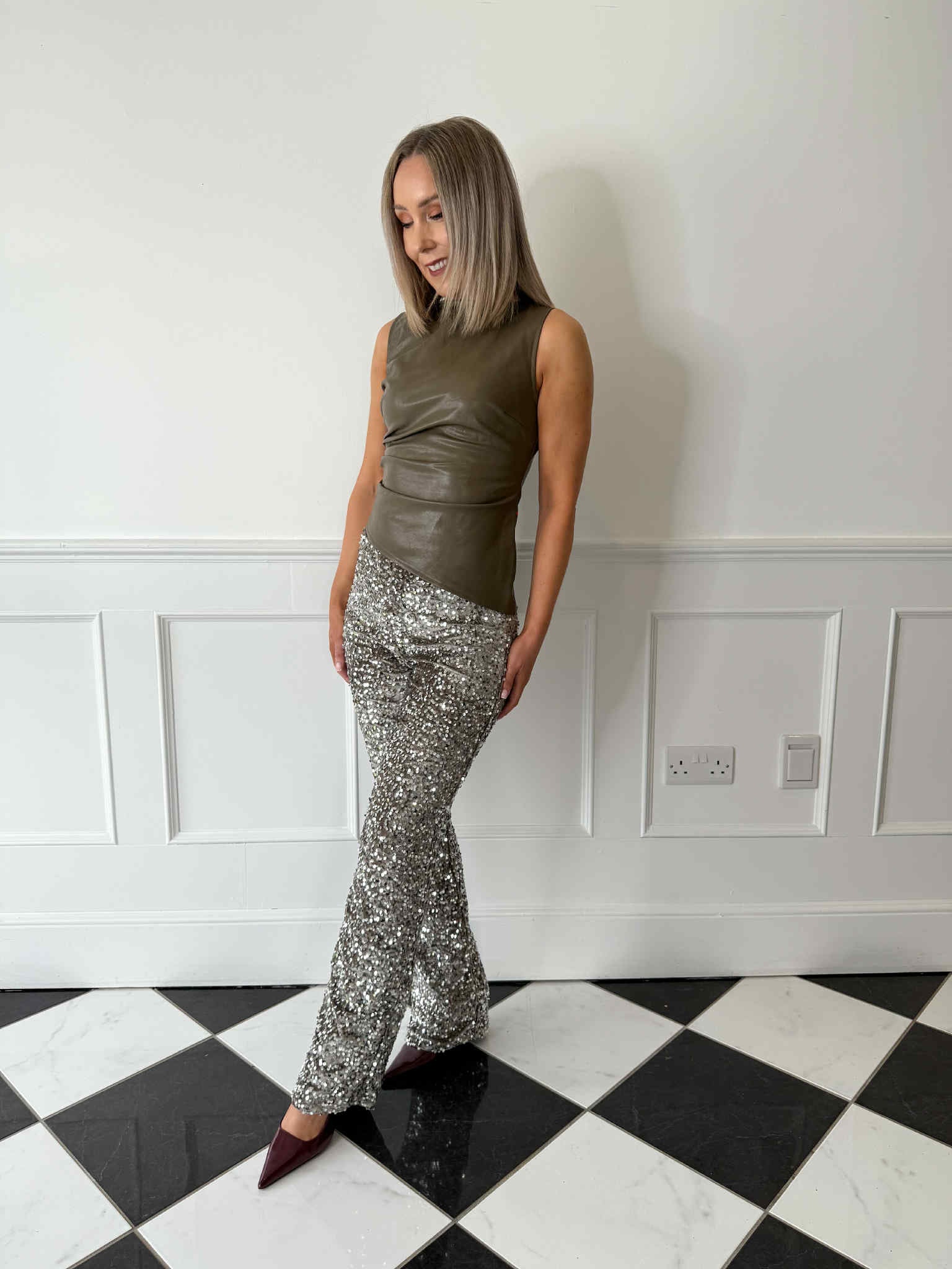 Straight-cut trousers crafted in a morel-silver tone with an all-over sequin finish. High elasticated waist for a comfortable, flattering fit. Designed in a regular silhouette with subtle drape and light movement.