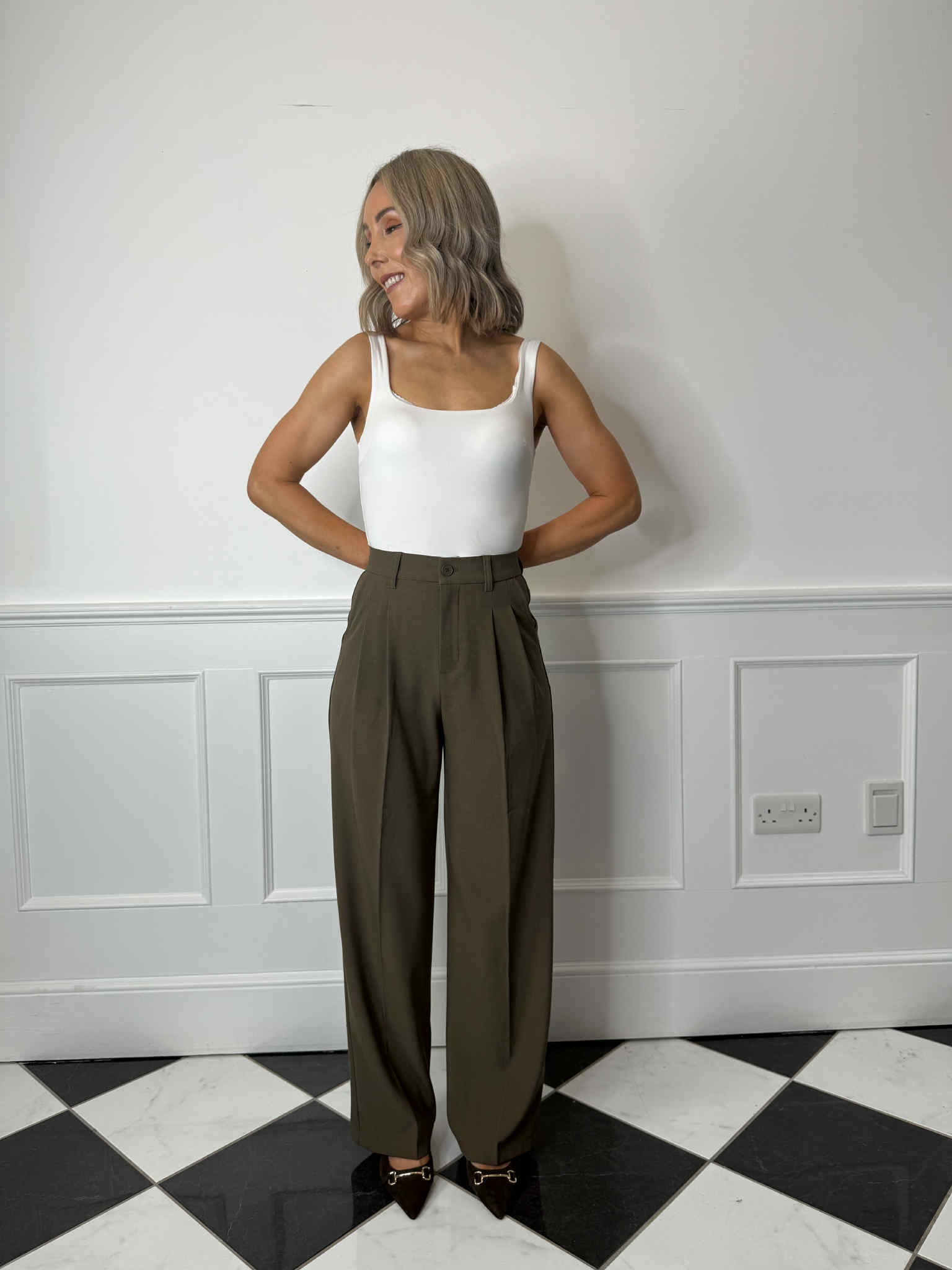Classic brown pleated trousers with a mid-rise waist and straight-leg fit. Soft, durable fabric makes them perfect for work or casual wear, easily styled with shirts or knits.