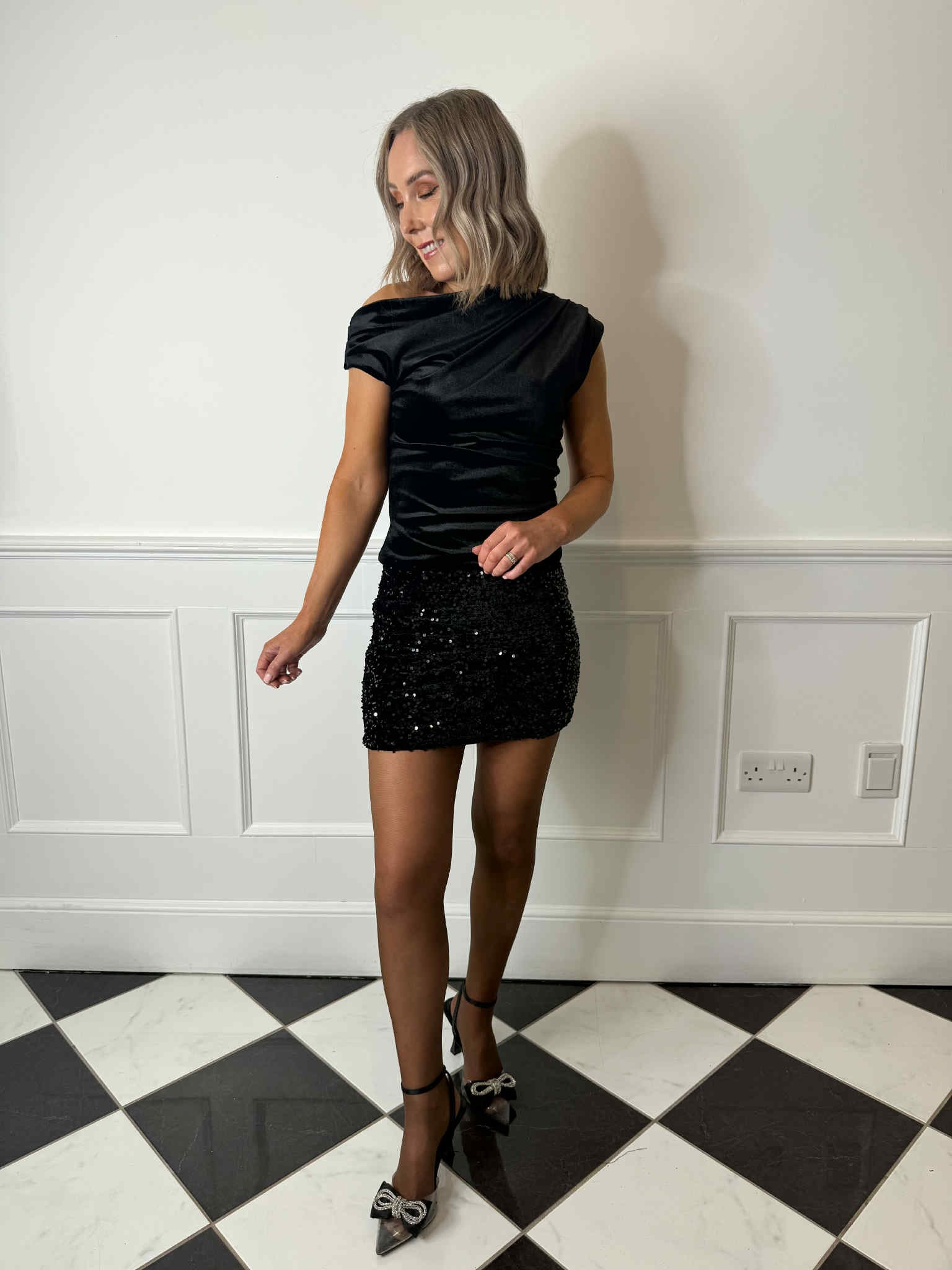 A statement mini skirt designed to bring subtle shine and modern edge to evening looks. Crafted from soft velvet adorned with all-over sequins, it catches the light with every movement while keeping a smooth, comfortable feel. The elasticated high waist enhances the fit, sitting neatly on the body and shaping a slim, flattering silhouette. Part of a coordinated set, it pairs effortlessly with the matching sequin tank top for a sleek, high-impact finish. Made with recycled polyester to help reduce waste and conserve natural resources.